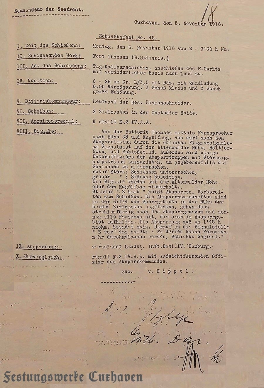 In Cuxhaven lagerten für die beiden Batterien in Fort Thomsen insgesamt 2000 Stück - 28 cm Haubitzen–Sprenggeschosse. Neben den Schießübungen der Geschützbatterien an der Deichlinie, führte auch das Fort Thomsen solche Verfahren durch. Im November 1914 wurden zwei solcher Schießversuche in die Oxstedter- sowie Altenwalder Heide ( 10 x L3,5 Sprenggranaten mit Bodenzünder) durchgeführt. Zur Sicherheit wurden die Bewohner Sahlenburgs die in der Schußbahn lagen, für diese Zeit evakuiert.