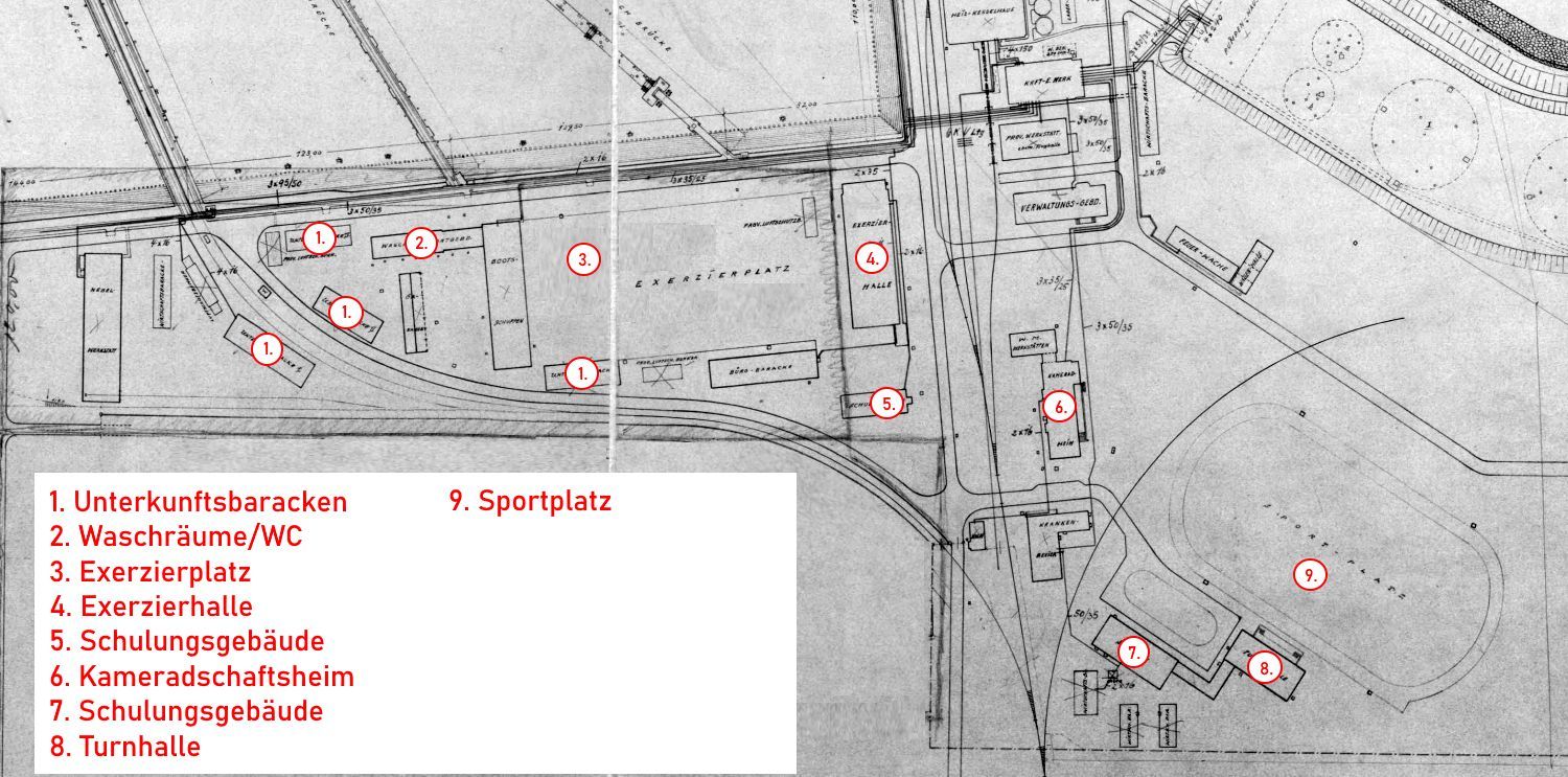 Im 1938 fertig gestellten Minensucherhafen in Groden, befand sich neben der zum technischen Betrieb notwendigen Strukturen auch ein Kasernenbereich. Dieser wurde vermutlich dazu benötigt, die Einheiten der Schiffsbesatzungen an Land unterzubringen. Allerdings wird hier auch eine Aus- und Fortbildung der Einheiten stattgefunden haben, die dafür nötigen Gebäude waren dafür entsprechend vorhanden. Leider fehlen über diesen Kasernenteil weitere schriftliche Hintergrundinformationen, so das man hier nur Vermutungen anstellen kann.