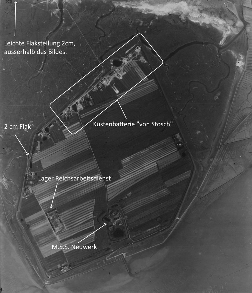 (leichte Flak 2 cm), diese befand sich an der Nordspitze des Aussendeichgeländes. Weiterhin befand sich auf dem Deich neben dem heutigen "Haus Seeblick" mindestens ein weiteres leichtes 2 cm Flakgeschütz das zur selben Einheit gehörte. Direkte Luftangriffe auf die Baustelle oder die fertige Stellung sind nicht bekannt.