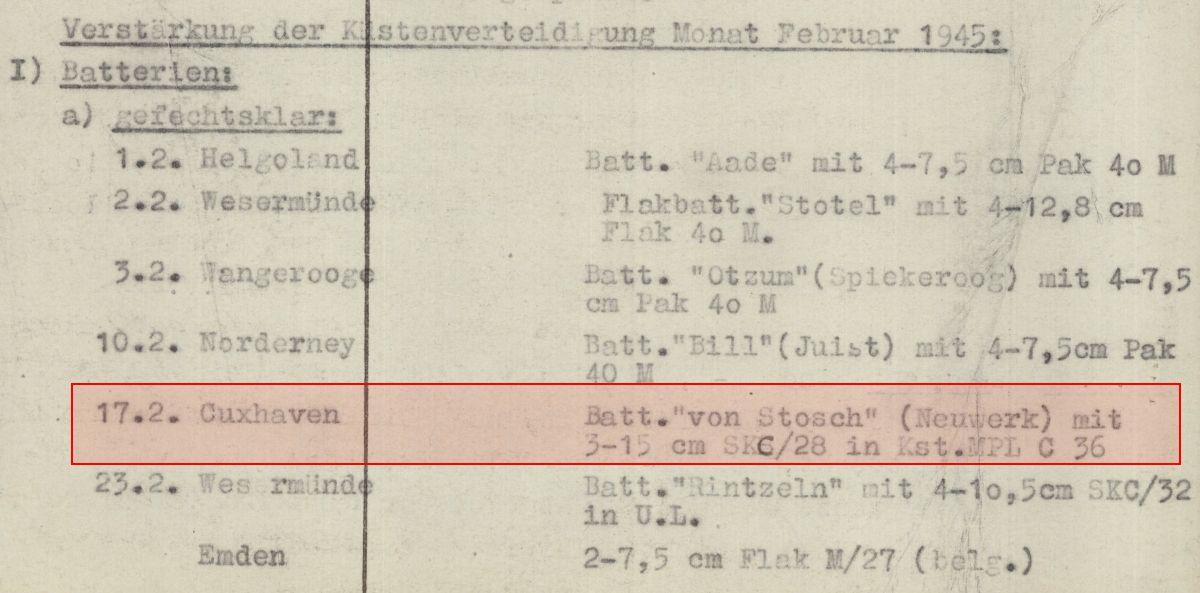 Bereits seit 1938 plante man zum Schutz der Elbmündung gegen einfahrende Feindverbände von See her, eine Küstenartilleriestellung auf Neuwerk oder Scharhörn. Durch verschiedene Faktoren wie zum Beispiel den Kriegsbeginn mit seinen Folgen für Personal, Gerät und weiterer Recourcen, verschob sich dieses Projekt allerdings immer weiter nach hinten. Aber wie bereits an anderer Stelle erwähnt stieg für die verantwortlichen Stellen, dass Risiko einer Invasion an der deutschen Nordseeküste doch. Im Rahmen des 1944 erweiterten Festungsausbaus in der deutschen Bucht, wurde letztendlich am Standort des eingedeichten Nordteils der Insel Neuwerk eine entsprechende Marineartilleriestellung gebaut. Hierbei handelte es sich um drei 15 cm SKC/28 in Kst.MPL C 36 (laut BAMA) und ein 15 cm SKC/28 in offener Bauweise. Die drei Geschütze 1, 2 und 4 waren in einem zur Seeseite offenen Schartenbunker nach Regelbau M 307 mit Stahlbetonkuppel verbaut. Das 4. Geschütz befand sich in einer offenen 360 Grad Betonbettung. Am Ende des nördlichen "Mittelwegs" befand sich der Kommandantenbunker mit dem Batterieleitstand, ein Stück weiter östlich der Maschinenhausbunker. Die Küstenbatterie erhielt den Namen "von Stosch", vermutlich nach dem preußischen General und Admiral "Albrecht von Stosch". Herangefahren wurden die Geschütze laut Zeitzeugen mit Halbkettenfahrzeugen, die den Weg nach Neuwerk durch das Wattenmeer nahmen. Trotz ortskundiger Warnungen, fuhren sich einige der Gespanne auf Grund der von den Soldaten unterschätzten Bodenverhältnisse fest. Sie konnten nur schwer wieder geborgen werden, ein Halbkettenfahrzeug musste die Flutphase im Wasser verbleiben. Gefechtsklar gemeldet wurde sie als M.A.A. 3./ 114 am 17.02.1945.