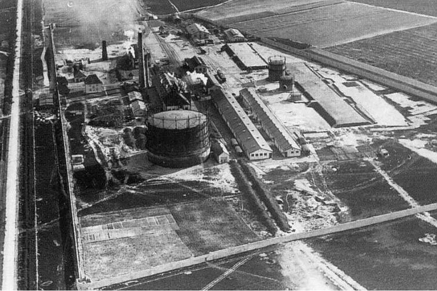 Niederdruckbehälter und Schornstein der Gasanstalt im südwestlichen Zipfel den Platzes.