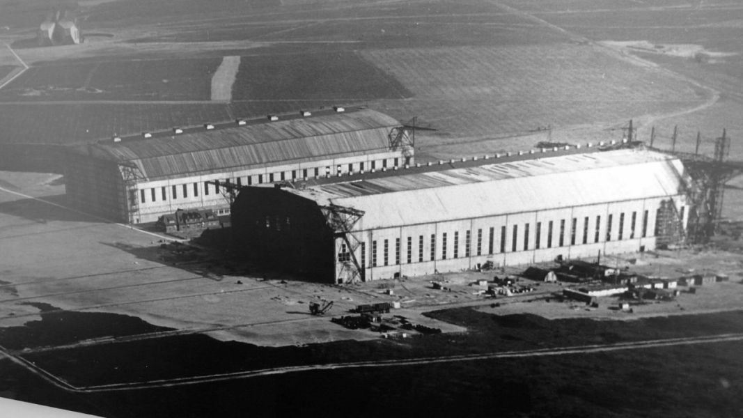 1 x drehbare Doppelhalle, 2 x feste Einzelhallen, 1 x feste Doppelhalle. Insgesamt 6 Liegeplätze für Luftschiffe.