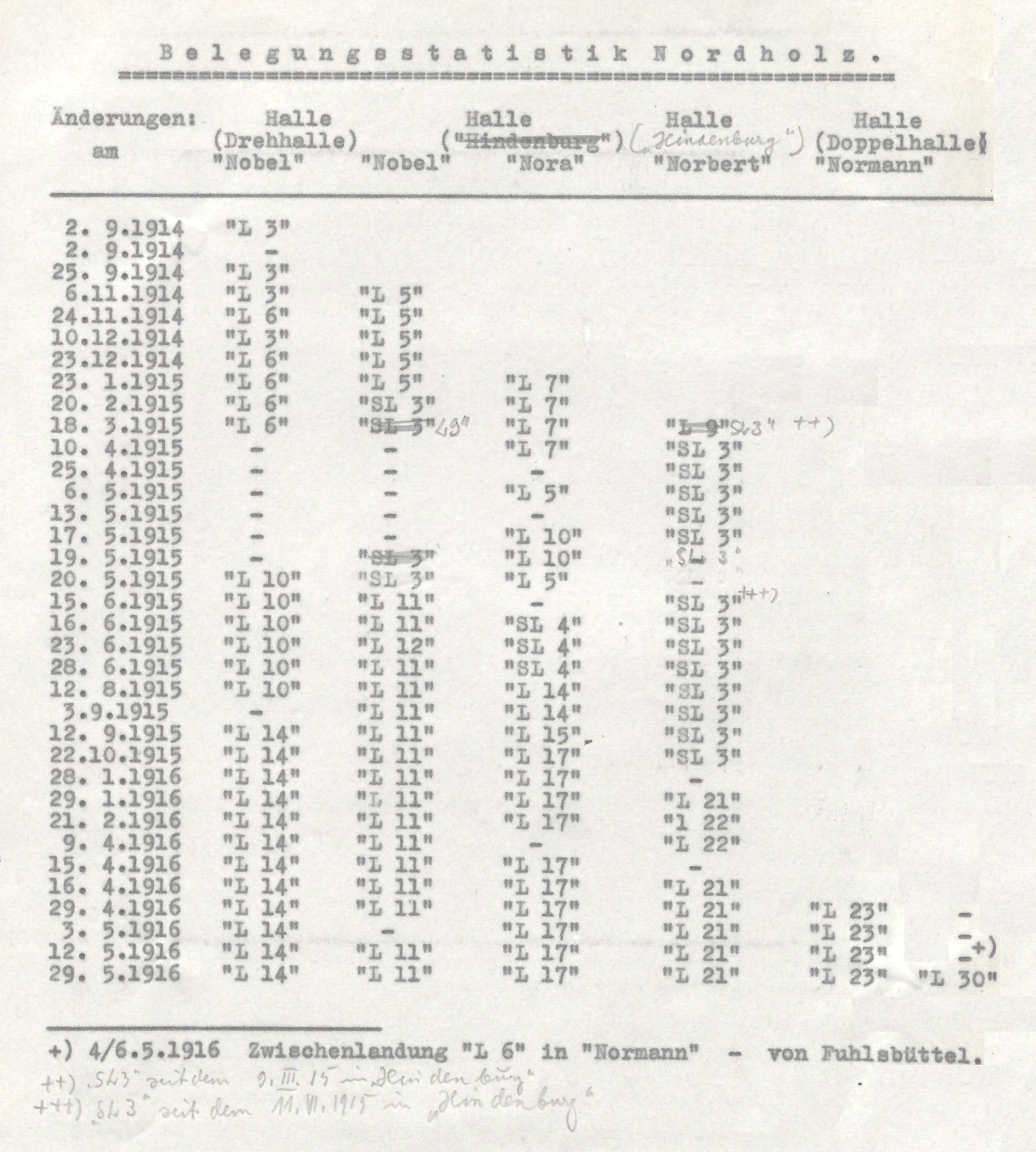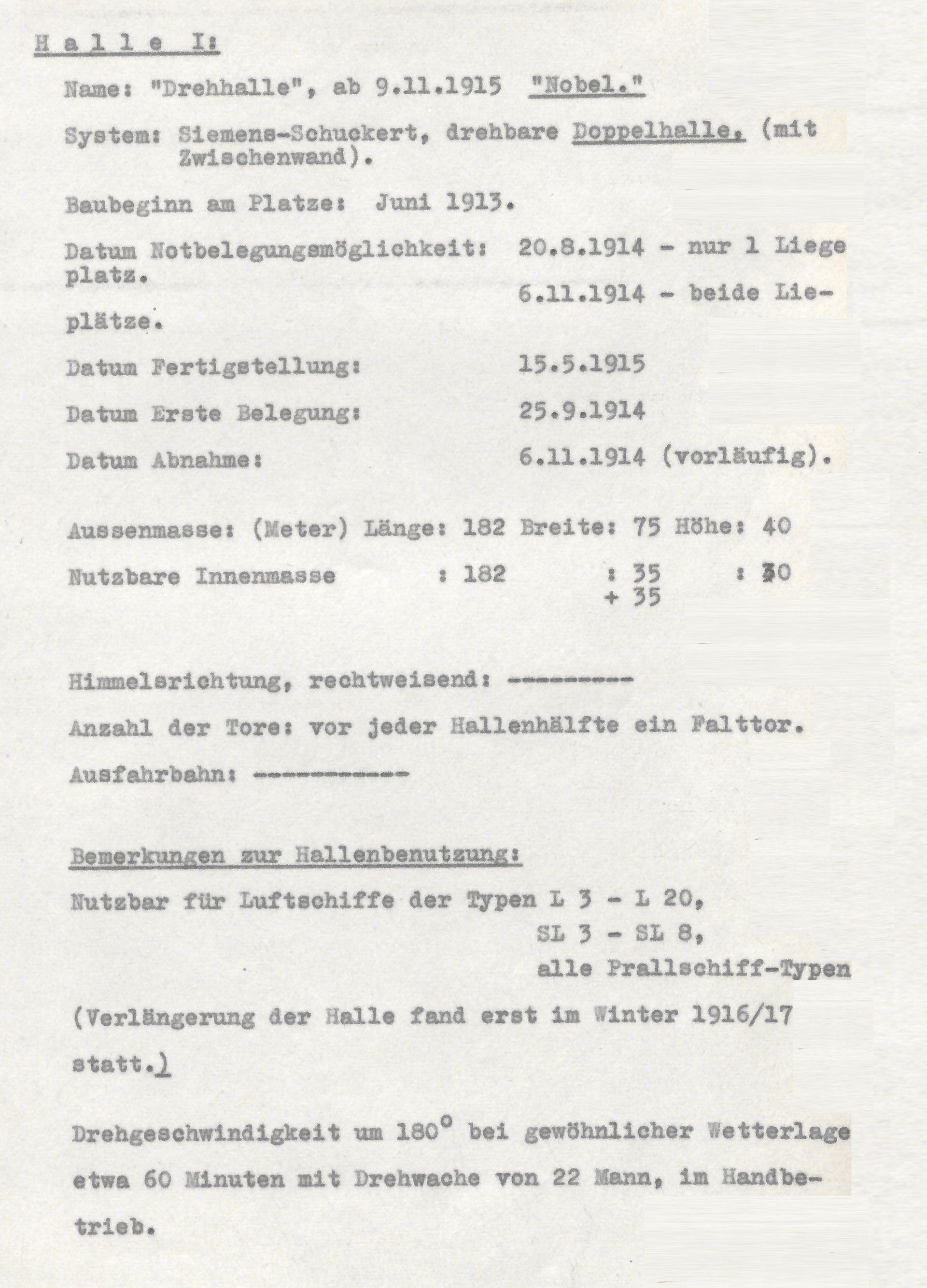 | 06.11.1914 | Klarmeldung der 2.Hallenhälfte der Drehhalle, Belegung abwechselnd durch "L 5" und "L 6" neben „L 3“. |