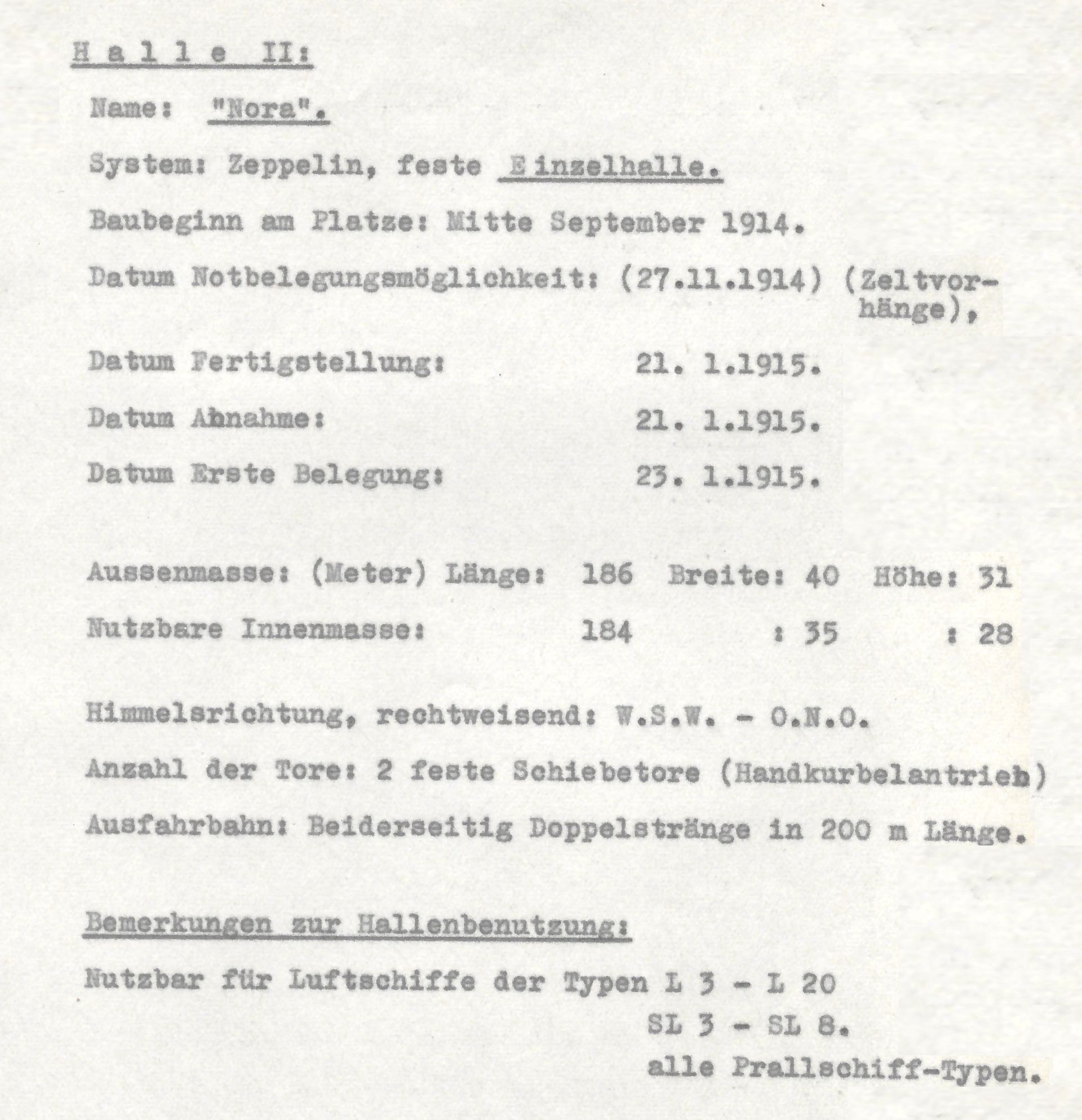 | Nordholz | Nora | 31.12.1915 | Feste Einzelhalle | 184 x 35 x 28 | fertig |