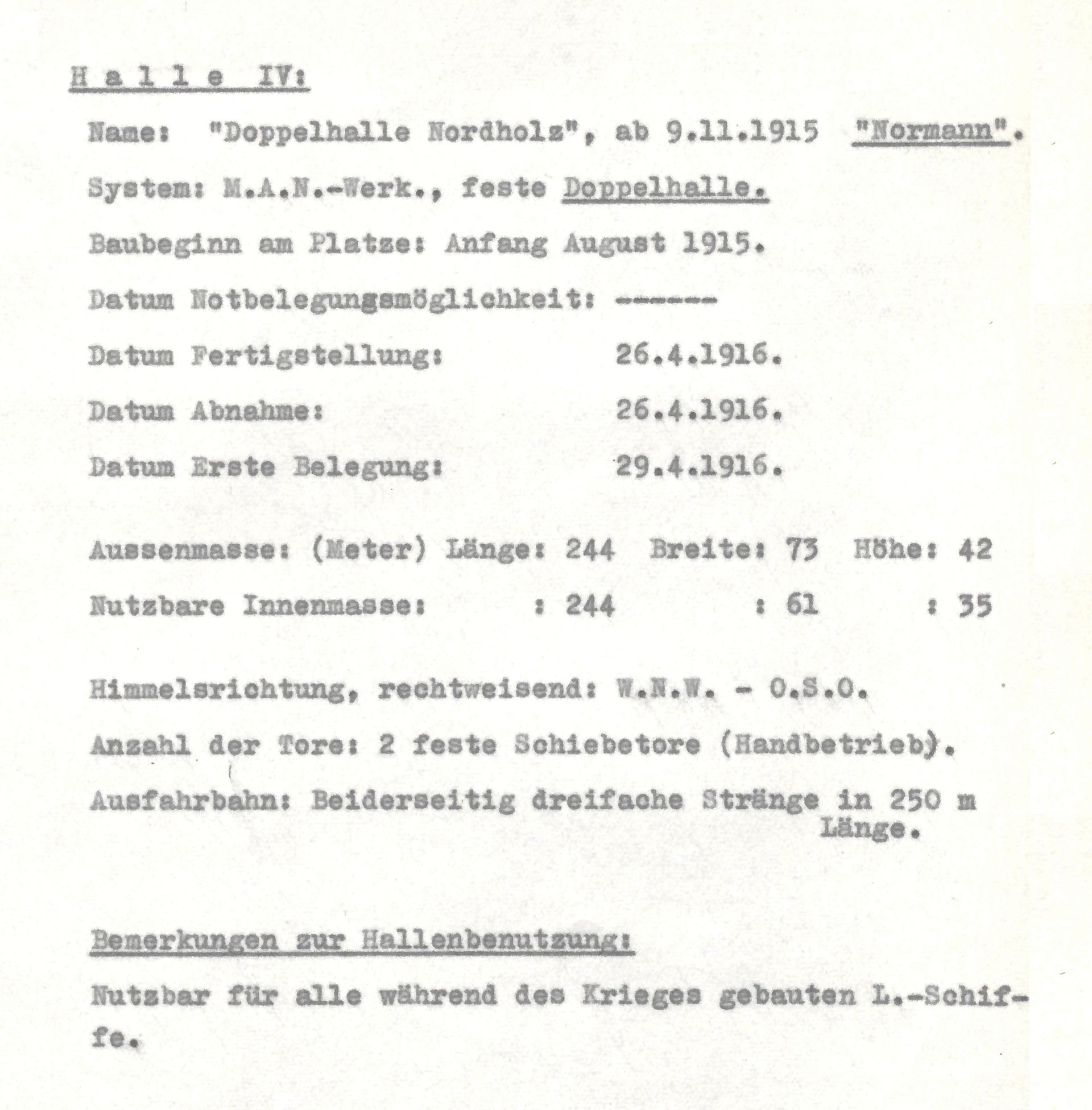 | 24.04.1916 | Fertigstellung neue Doppelhalle "Normann". |