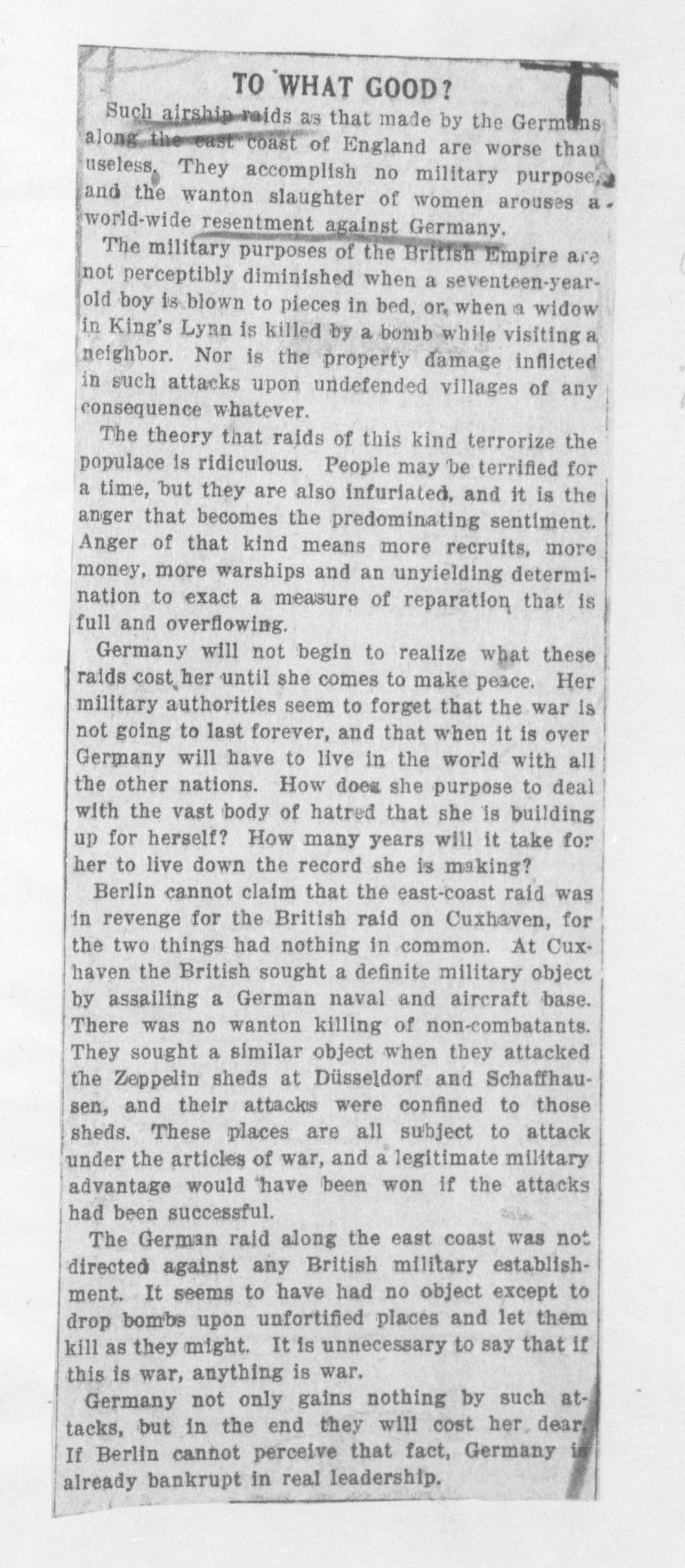 Solche Luftschiffangriffe wie die der Deutschen an der Ostküste Englands sind mehr als nutzlos. Sie erfüllen keinen militärischen Zweck und das mutwillige Abschlachten von Frauen weckt weltweit Empörung gegen Deutschland.