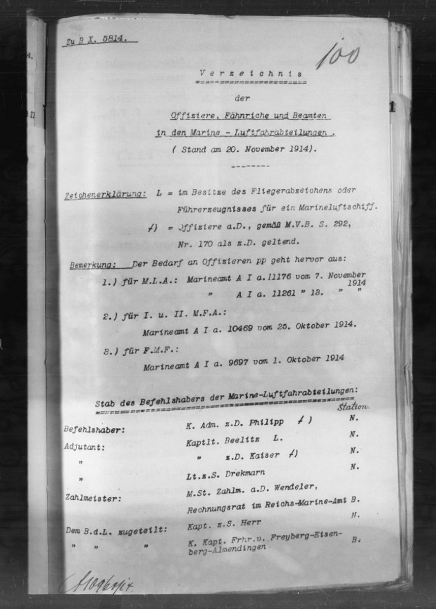 | 14.10.1914 | Übersiedlung des Stabes der MLA nach Nordholz. |