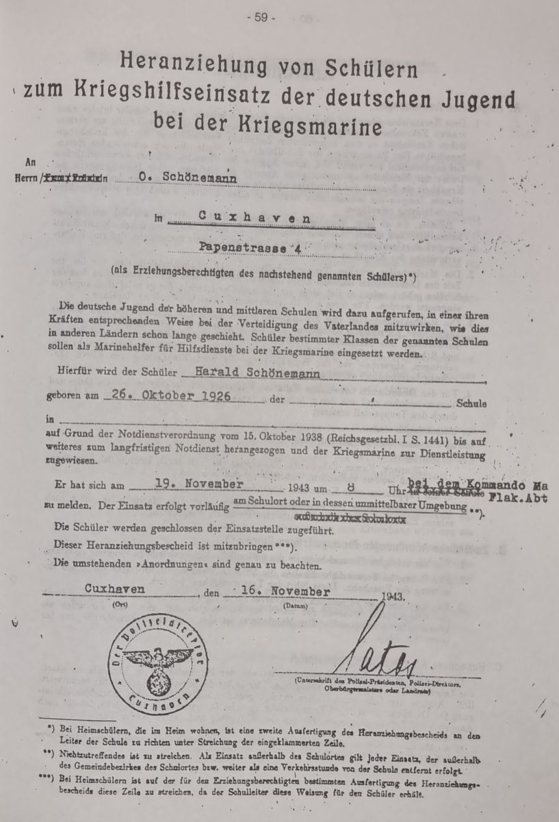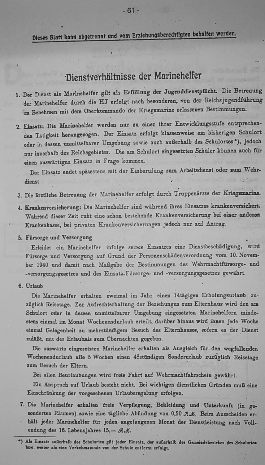 Bereits im Februar 1943 wurden wir, die Schüler unserer Klasse von dem Amtsarzt Dr.Zedelius auf unsere Verwendungsmöglichkeit nach der Schulzeit untersucht. In dem Tauglichkeitsausweis wurde vermerkt: "1.2.1943 tauglich für Marinehelfer”. Damit waren die Voraussetzungen bei uns für die "Heranziehung von Schülern zum Kriegsdienst der deutschen Jugend zur Kriegsmarine" erfüllt.