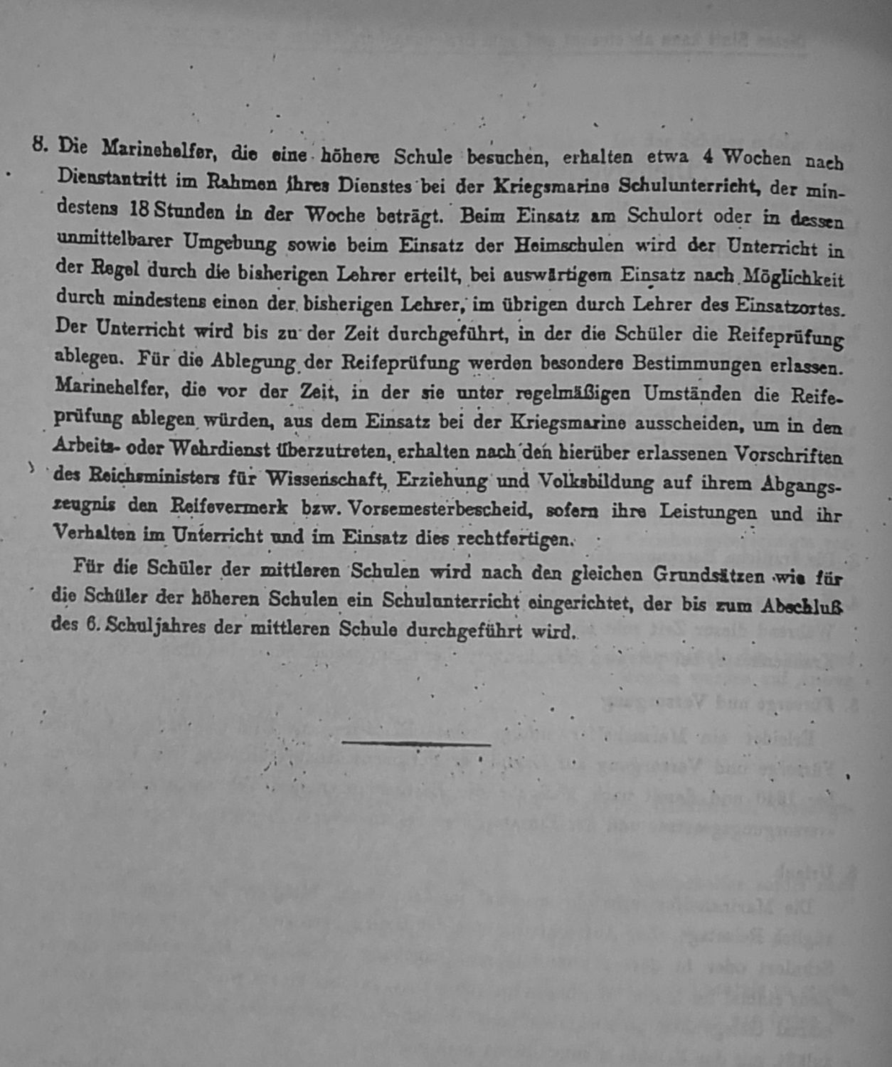 In dem uns zugegangenen Bescheid heißt es u.a.: "Die deutsche Jugend der höheren und mittleren Schulen wird dazu aufgerufen, in einer ihren Kräften entsprechenden Weise bei der Verteidigung des Vaterlandes mitzuwirken, wie dies in anderen Ländern schon lange geschieht”. Die rechtliche Grundlage hierfür gab die Notdienstverordnung vom 15.Oktober 1938, nach der die Schüler bis auf weiteres zum langfristigen Notdienst herangezogen und der Kriegsmarine zur Dienstleistung zugewiesen werden.Am Mittwoch, Donnerstag und Freitag legten wir in der Schule unsere Prüfungen für die Mittlere Reife ab. Innerhalb einer kurzen Feier wurden uns dann am Sonnabend die Zeugnisse erteilt. Der Sonntag blieb uns als letzter Tag in der Familie. Am zweiten Tag nach unserer Schulentlassung, dem Montag, mußten wir, die Jungen unserer Klasse, uns auf dem Schulhof einfinden. Mit Militärmusik und in Begleitung der Mädchen unserer Klasse, wurden wir abgeholt.