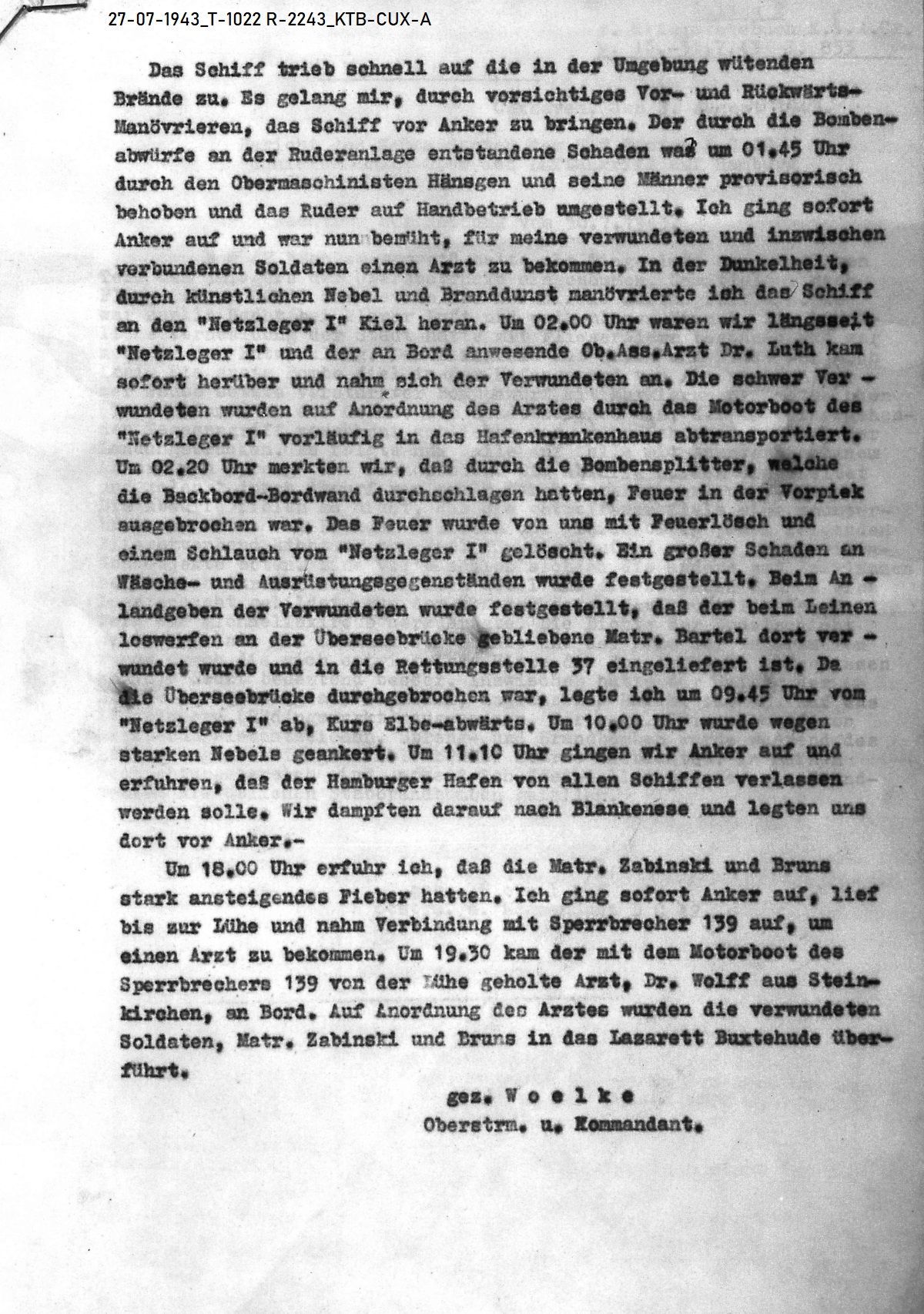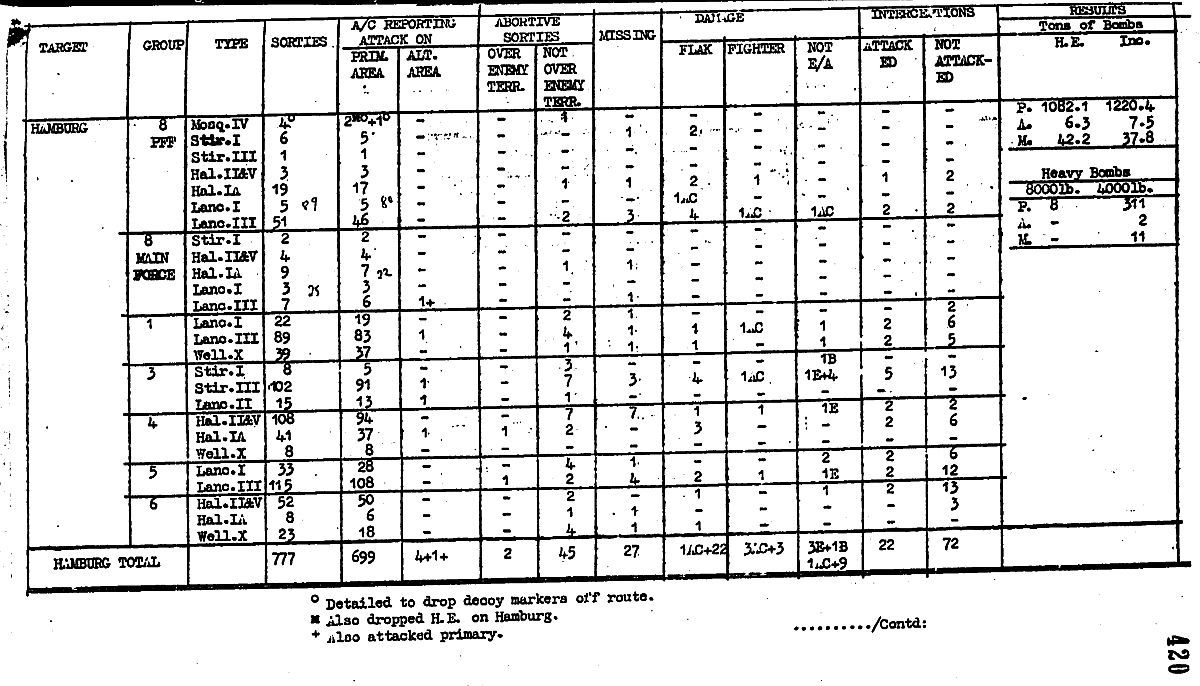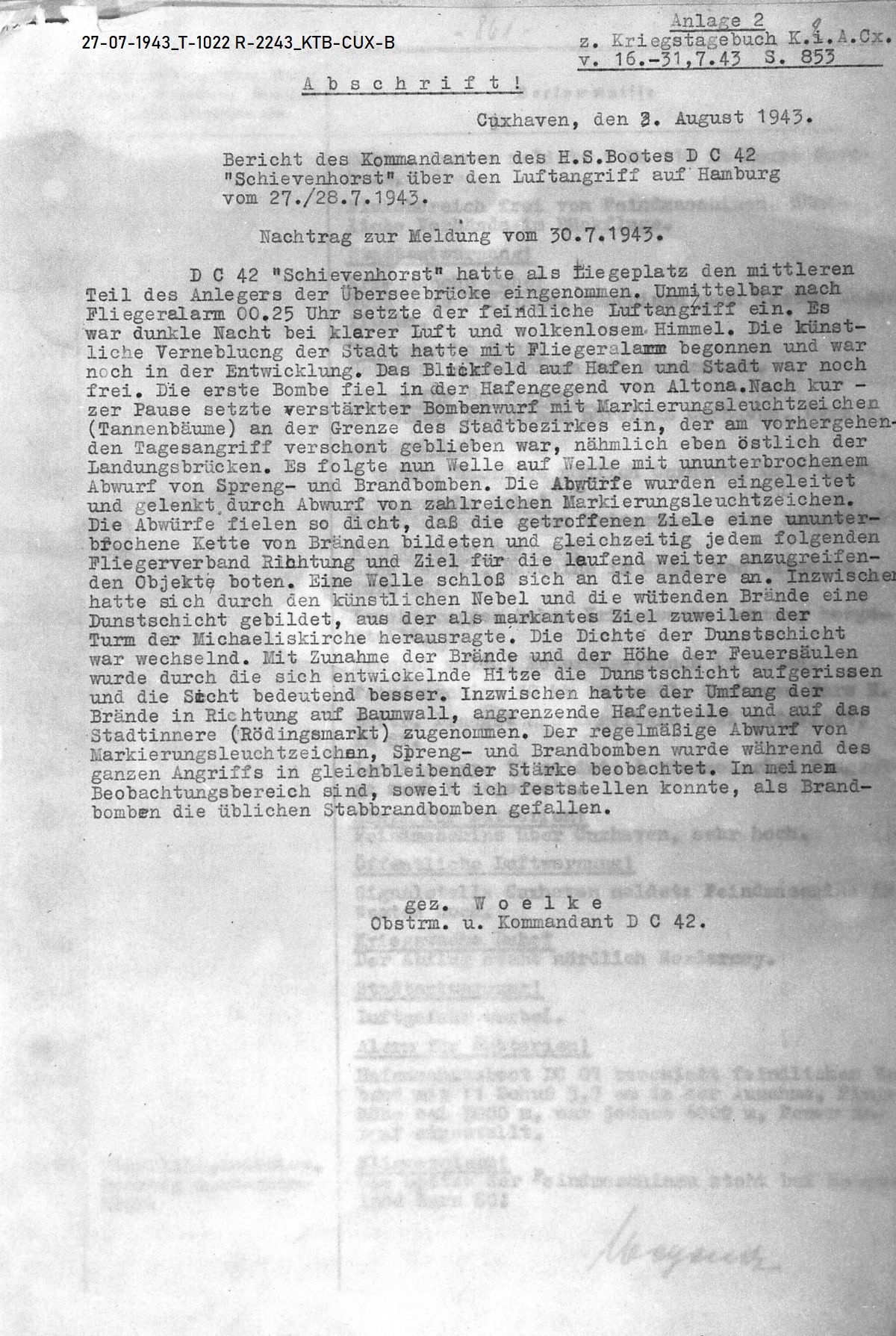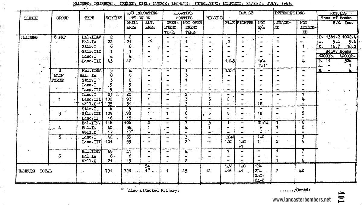 In der vierten Nacht seit dem 24.Juli 1943 war eine Bomberstreitmacht von 740 Maschinen zum Angriff auf Hamburg entsandt worden.Die Streitmacht bestand aus 329 Lancastern, 235 Halifax’s, 105 Stirlings, 66 Wellingtons und 5 Mosquitos. Im Anflug auf die Elbmündung bauten sich bereits große Wolkenformationen mit entsprechender Gewitterdynamik auf. Während der Endphase zum Zielgebiet, wurden die Flugbedingungen durch die Unwetter dann allerdings so heftig, das der Angriff größtenteils aus dem Ruder lief und zum Desaster wurde. Das hatte zur Folge, dass weniger als die Hälfte der Bomber überhaupt bis nach Hamburg vorstoßen konnte. Viele Maschinen griffen unter den widrigen Wetterbedingungen stattdessen Flakstellungen und Gelegenheitsziele im Umfeld von Bremen, Wesermünde und Cuxhaven an. Größere Schäden sind hierdurch allerdings nicht gemeldet worden. Aber auch das Stadtgebiet Hamburgs wurde an vielen Stellen wieder erheblich getroffen. Die Folgen waren erneut hohe Menschenverluste und schwere Zerstörungen. Gut 30 englische Bomber gingen während des Angriffs unter anderem durch die deutsche Luftabwehr verloren. Die meisten Flugzeuge so wird allerdings vermutet, wurden durch Kollisionen untereinander bei schlechter Sicht, Blitzeinschlägen und sonstiger witterungsbedingter Einflüsse zum Absturz gebracht.