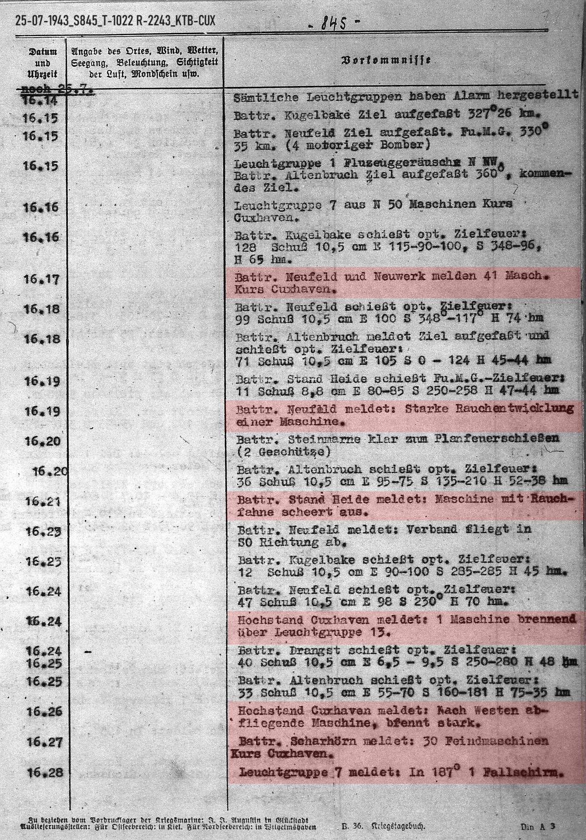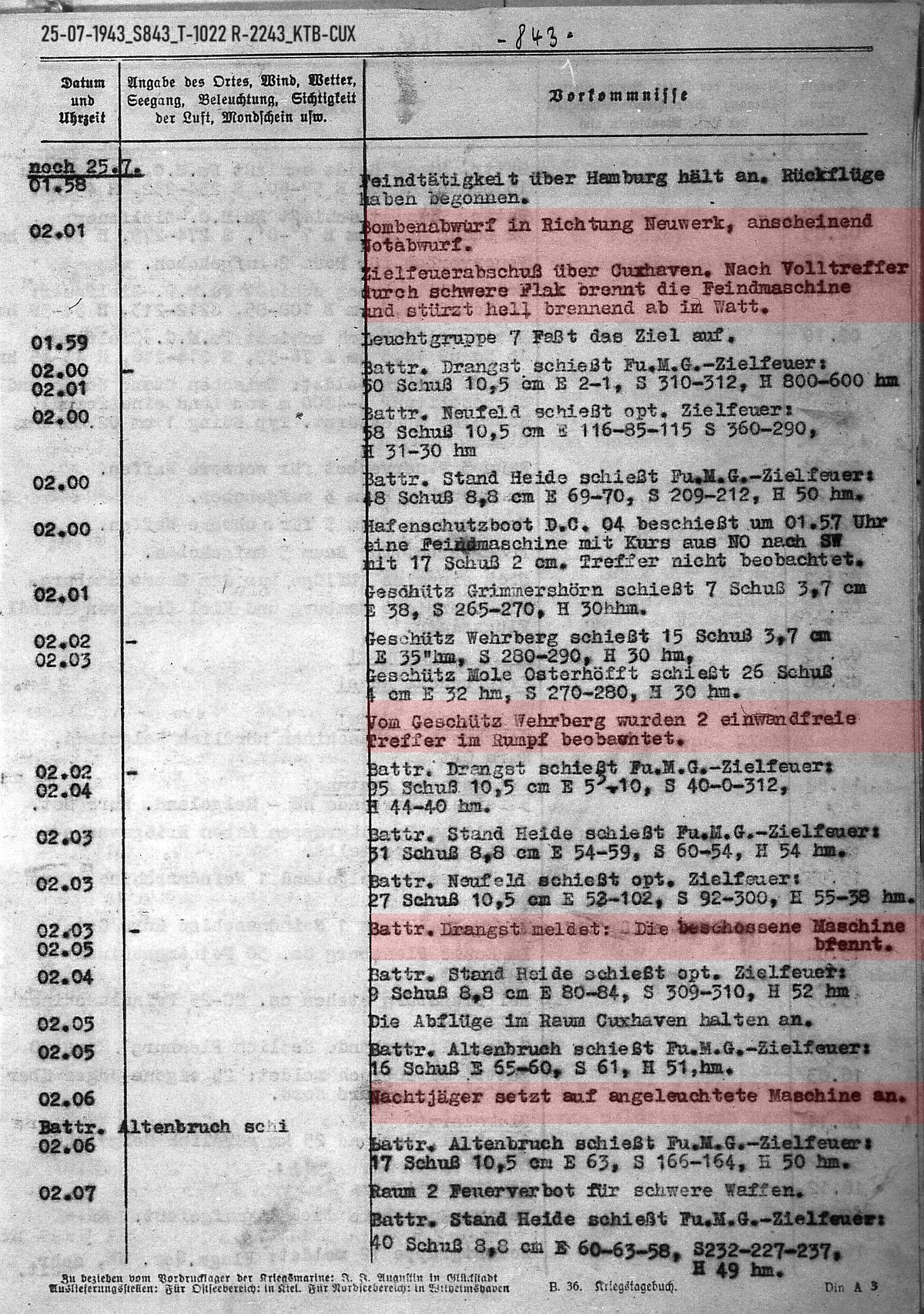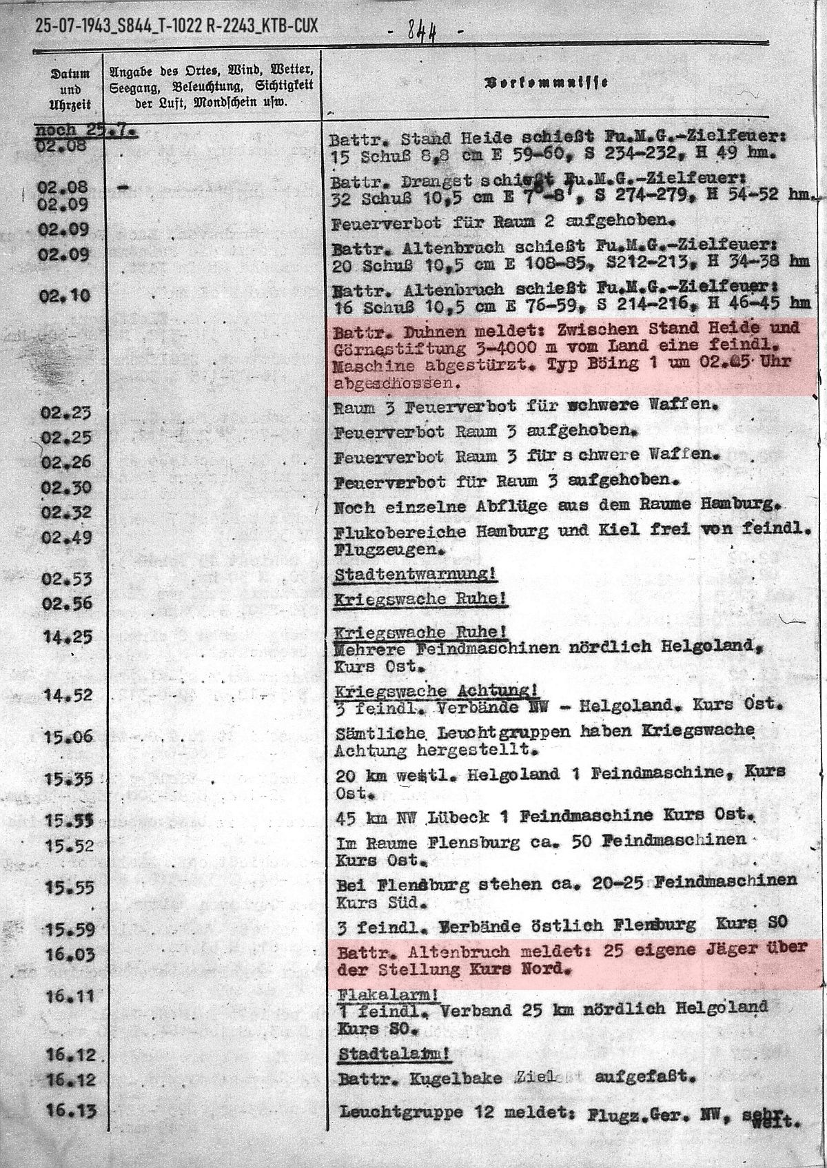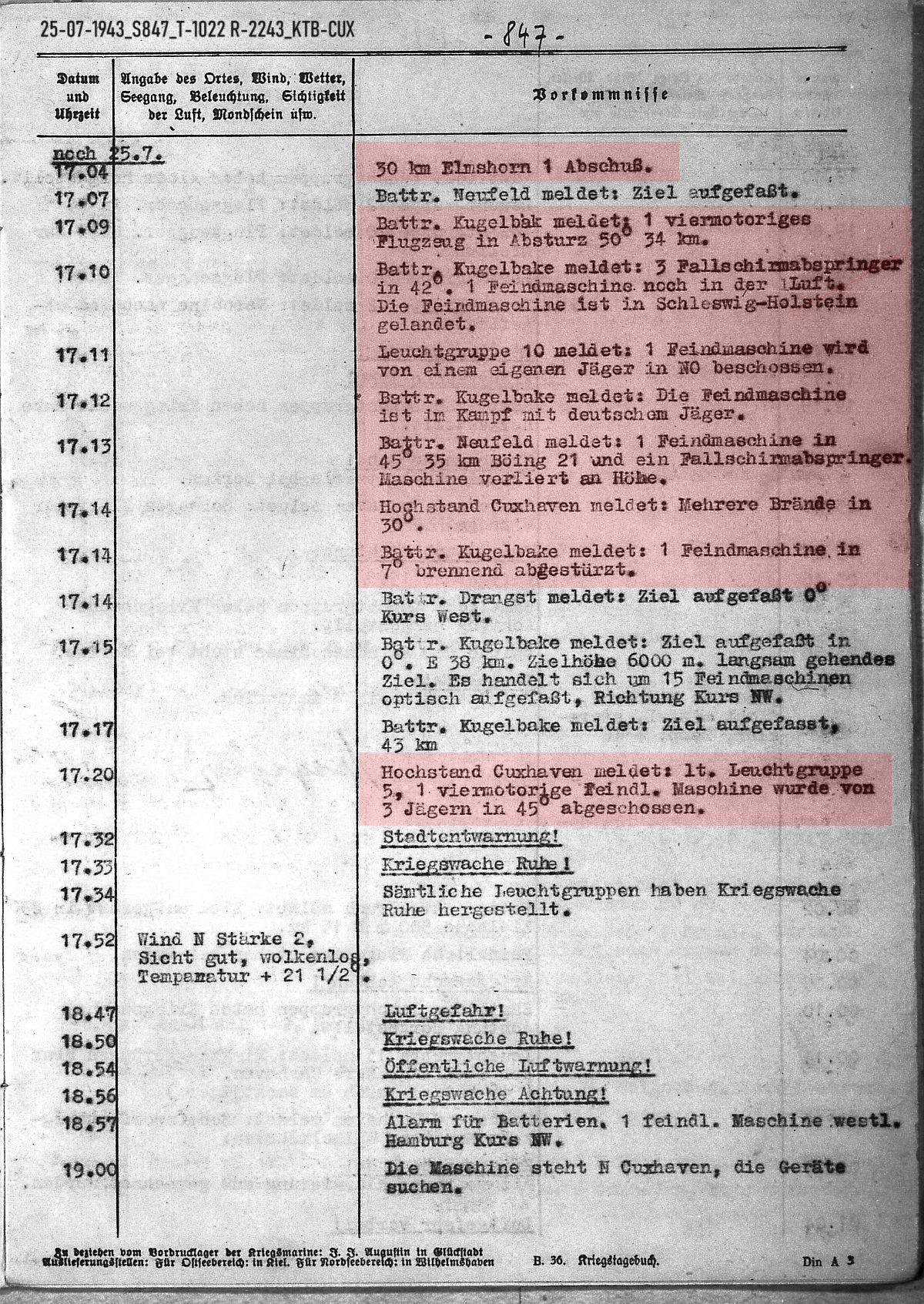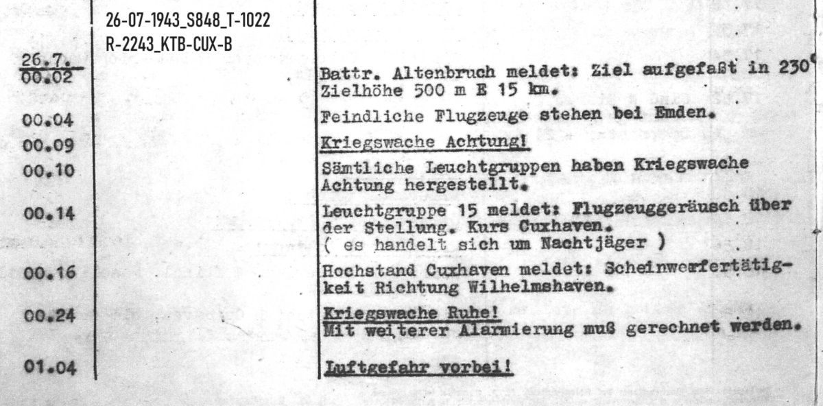 24/25.07.1943 - Gefechtsmeldungen vom ersten Überflug alliierter Bomberformationen während der "Operation Gomorrha" im Abschnitt Cuxhaven.