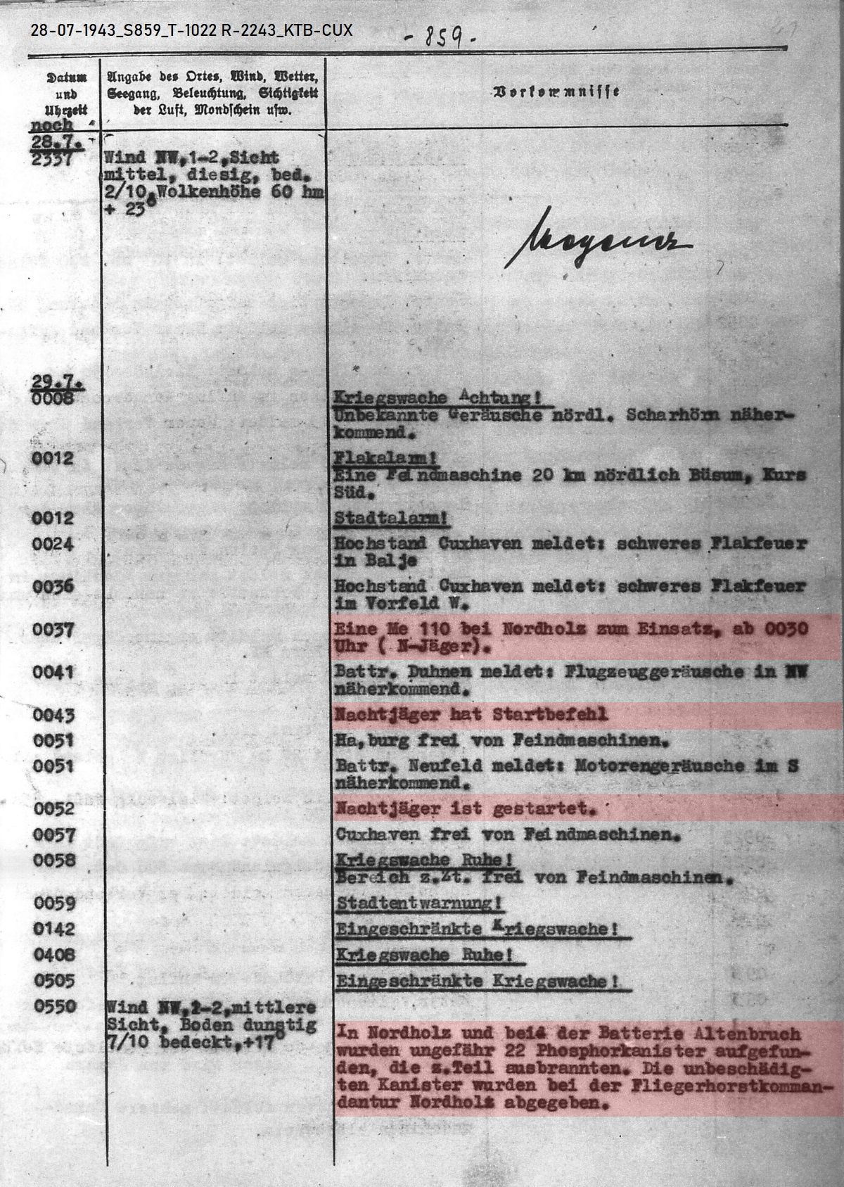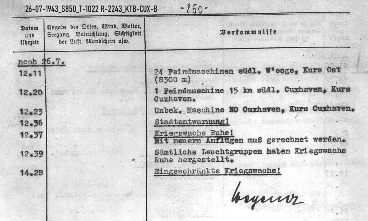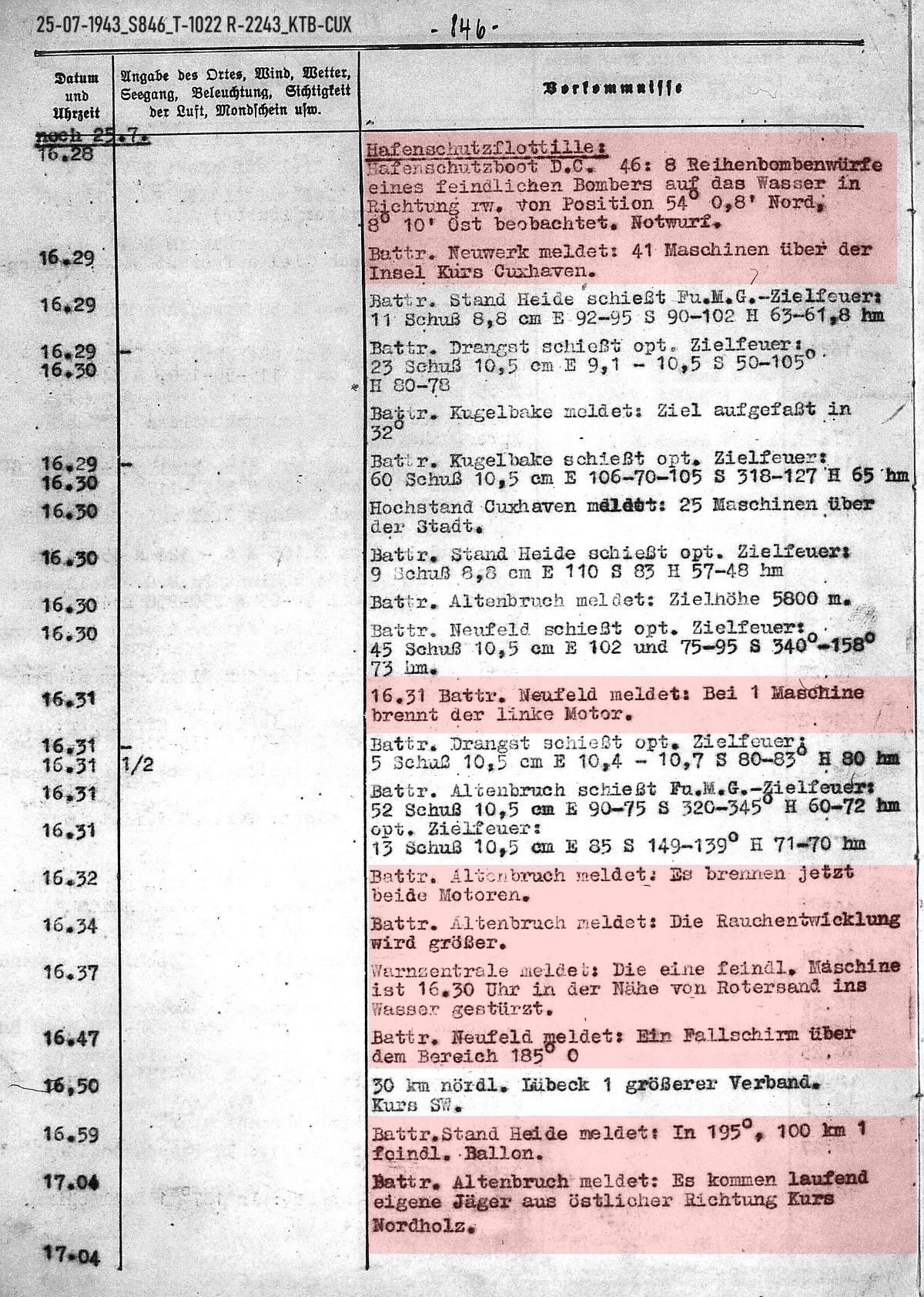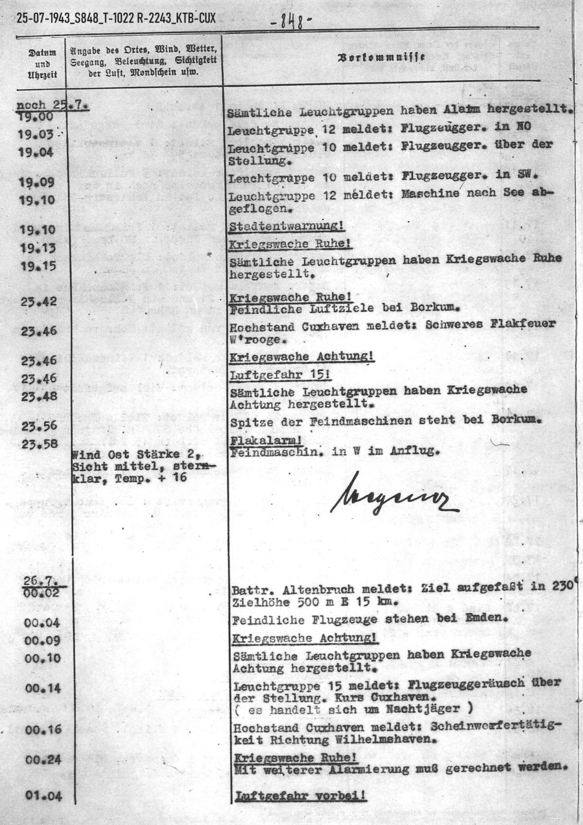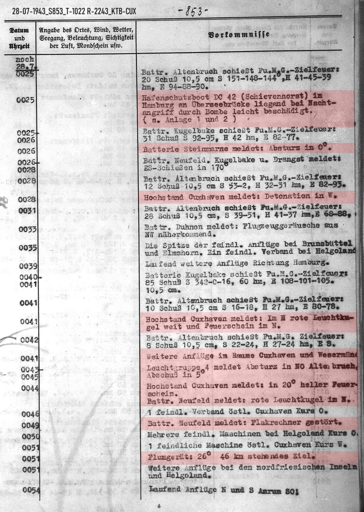 24/25.07.1943 - Gefechtsmeldungen vom ersten Überflug alliierter Bomberformationen während der "Operation Gomorrha" im Abschnitt Cuxhaven.