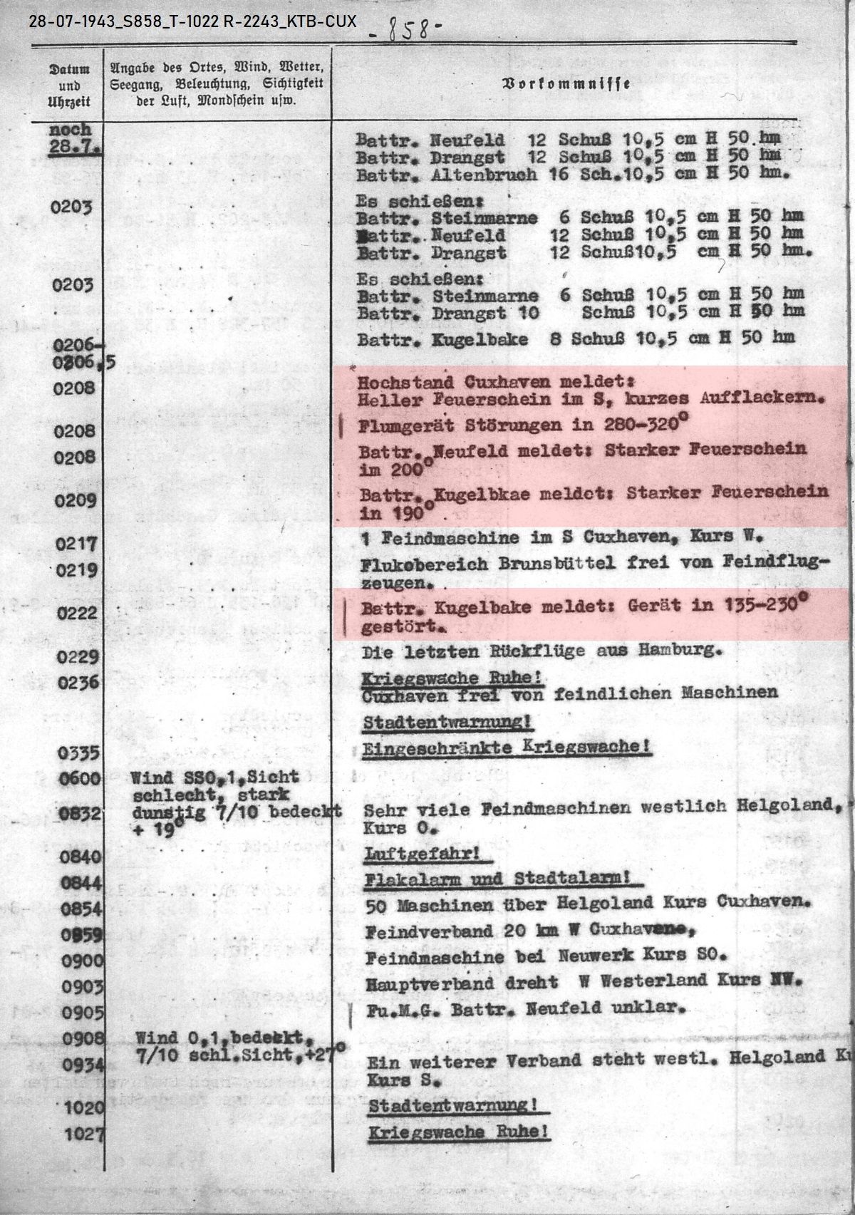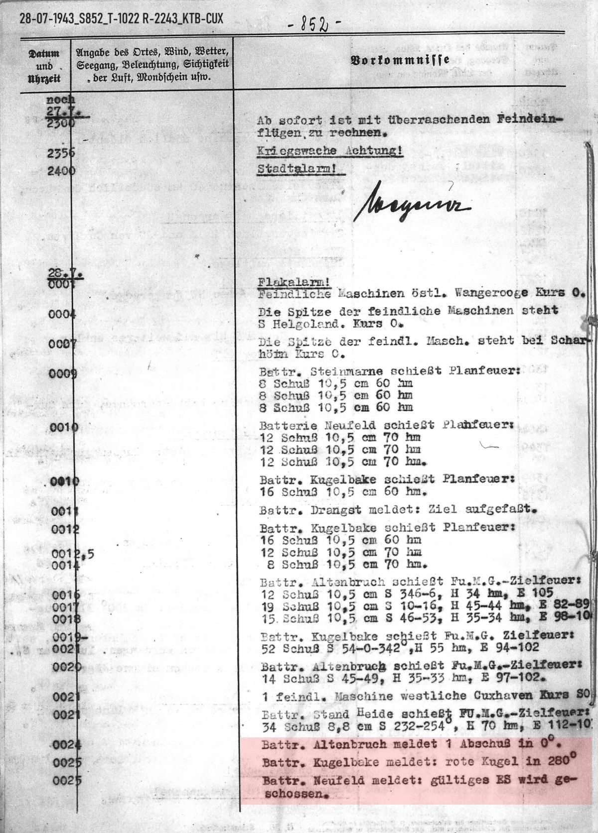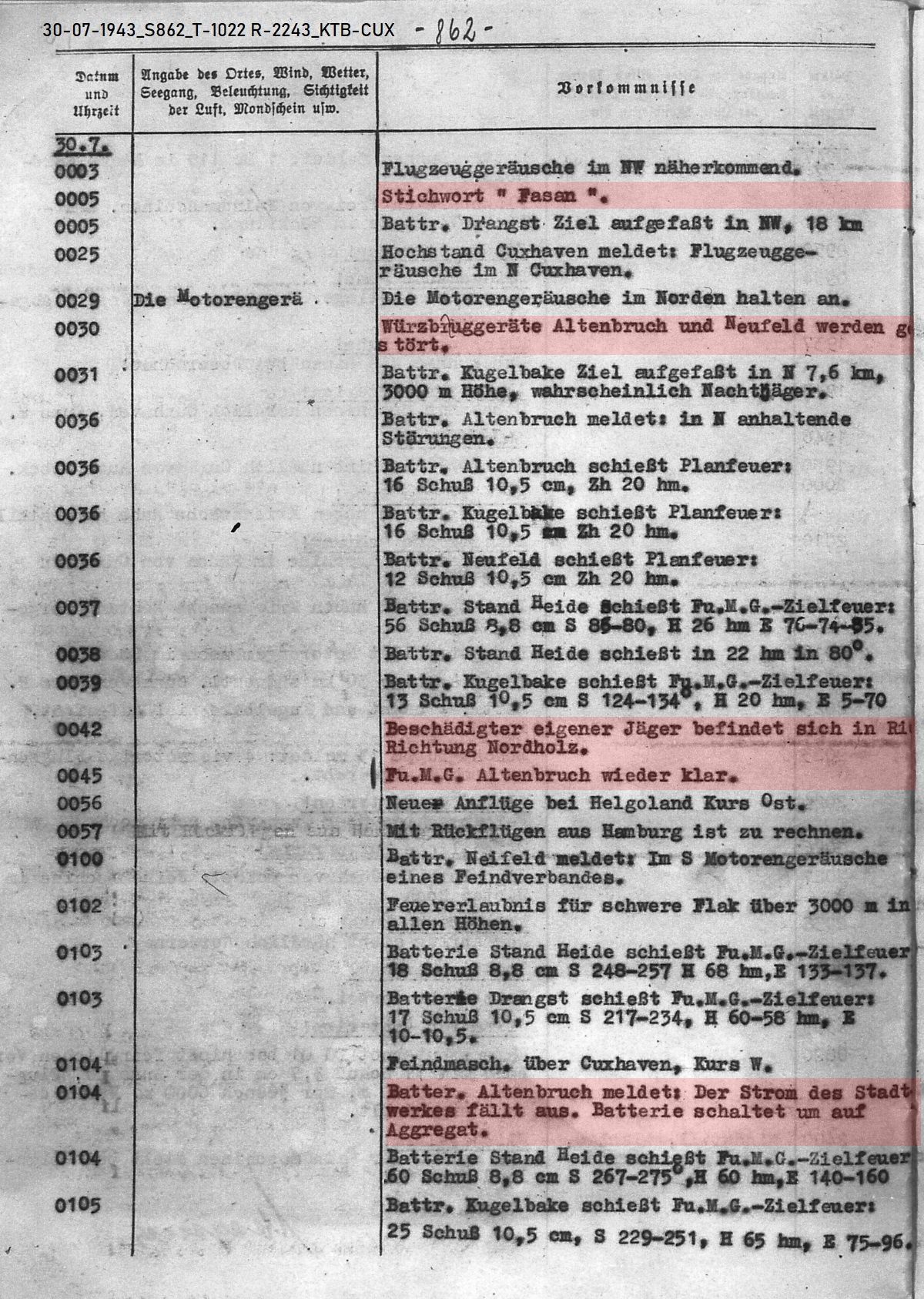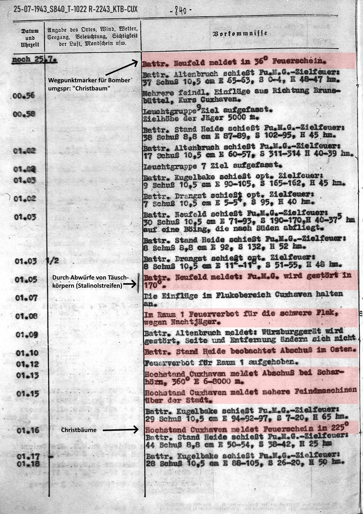 24/25.07.1943 - Gefechtsmeldungen vom ersten Überflug alliierter Bomberformationen während der "Operation Gomorrha" im Abschnitt Cuxhaven.