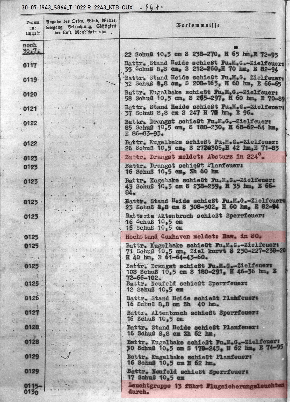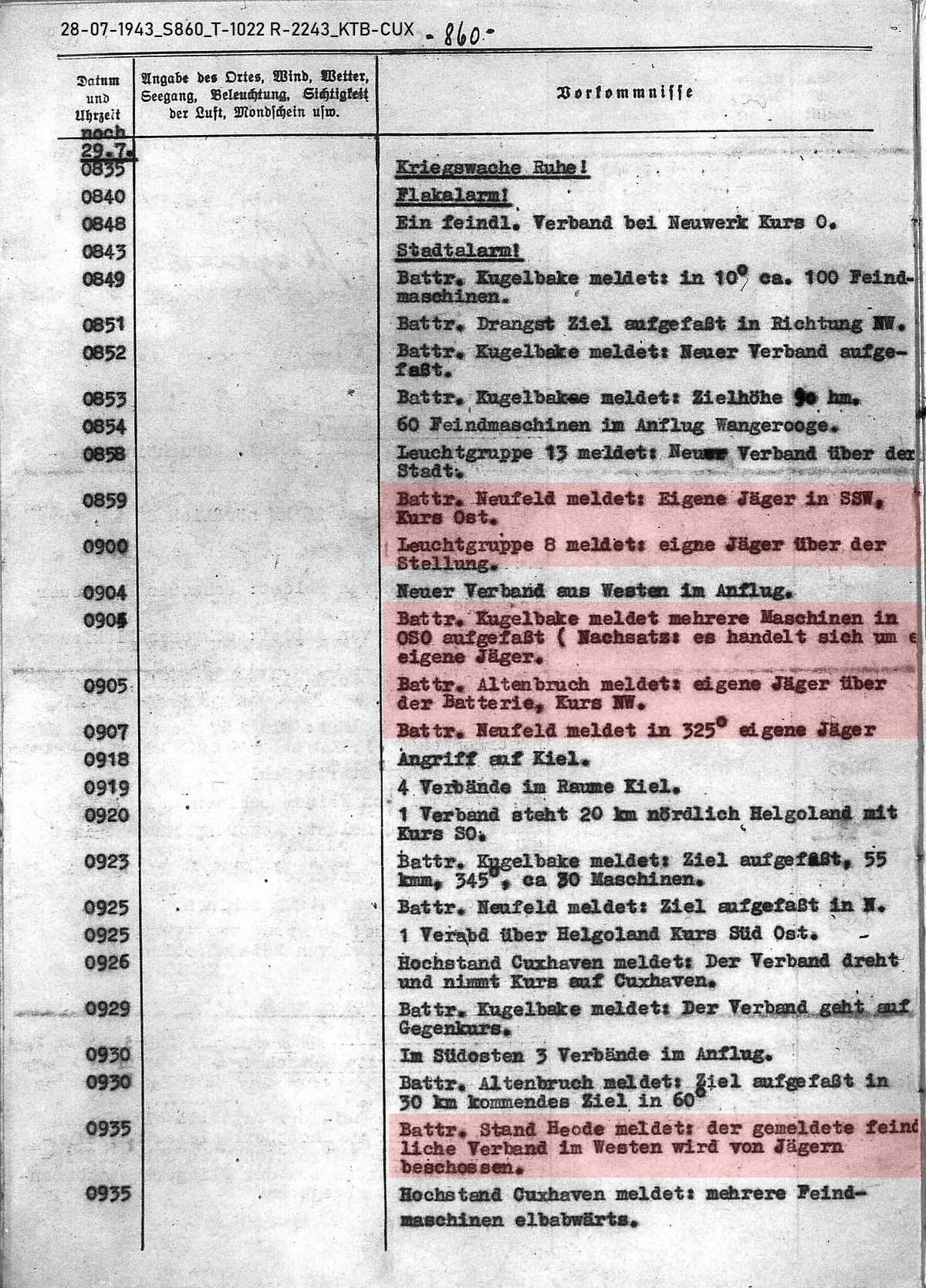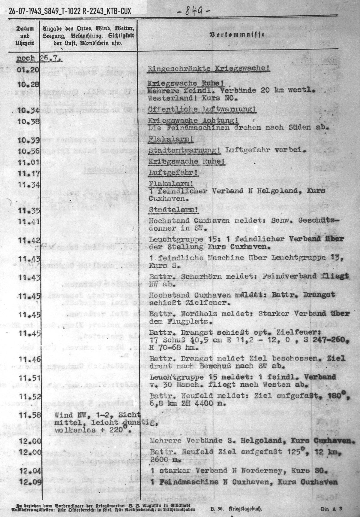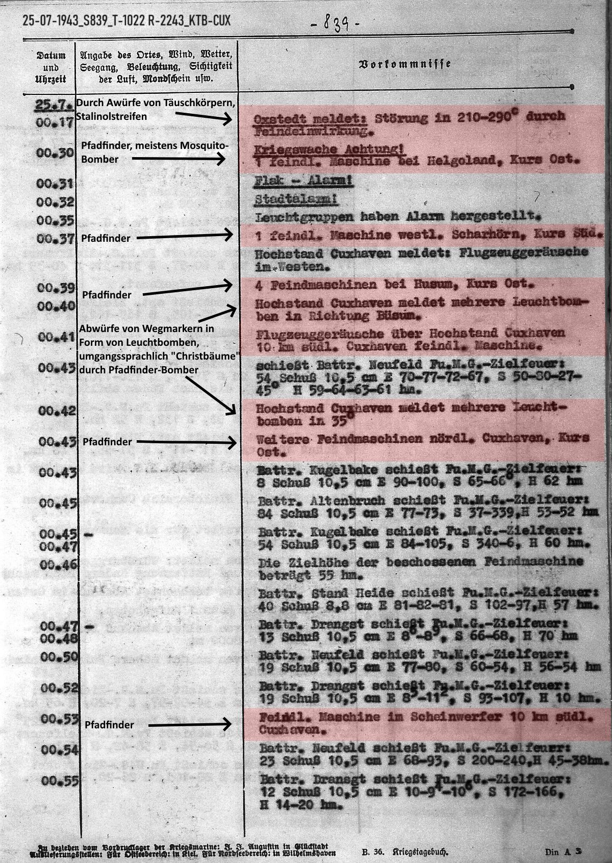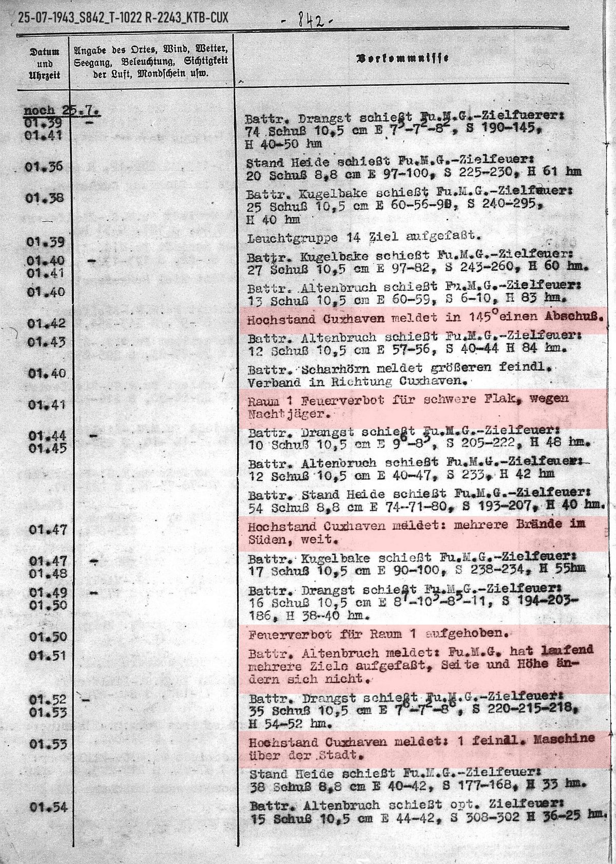 24/25.07.1943 - Gefechtsmeldungen vom ersten Überflug alliierter Bomberformationen während der "Operation Gomorrha" im Abschnitt Cuxhaven.