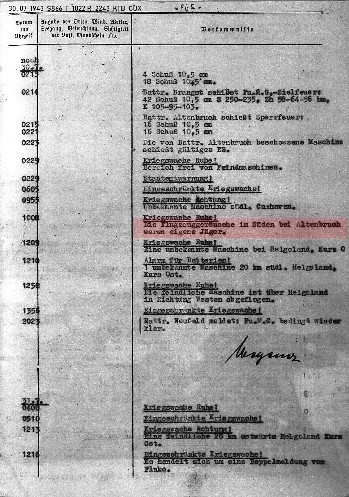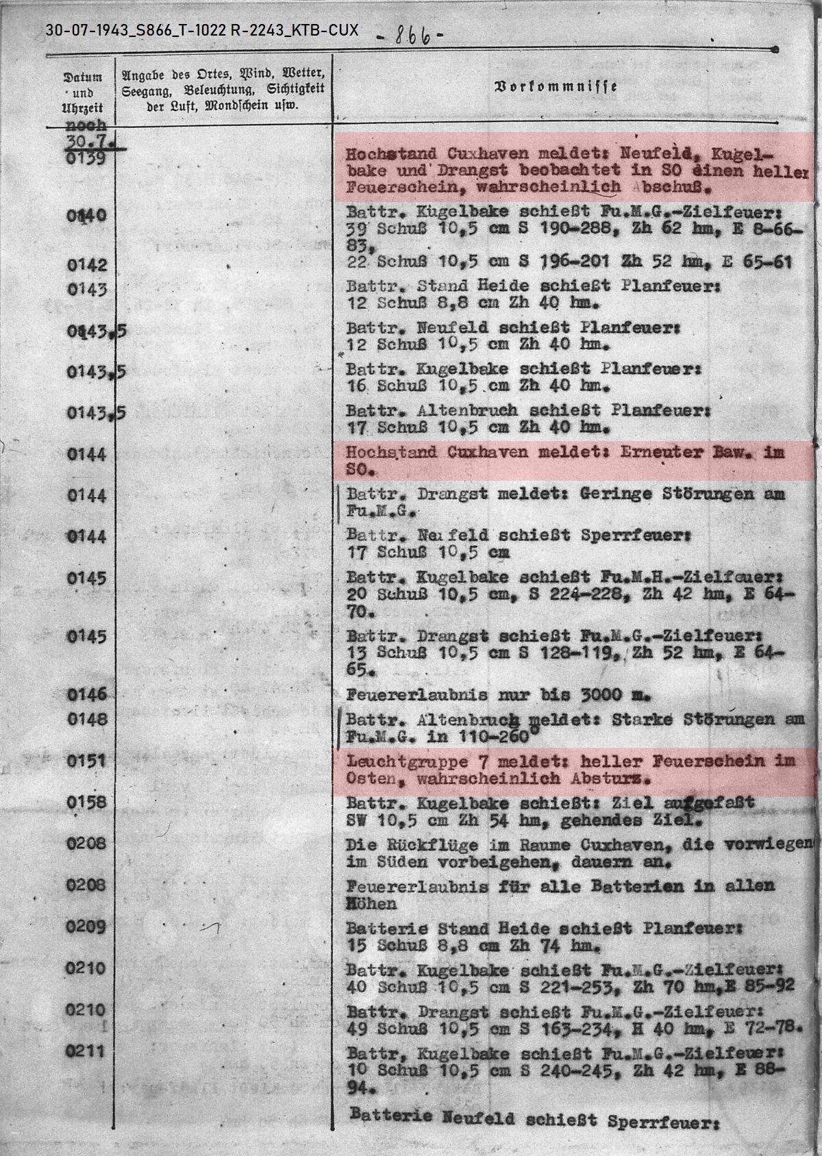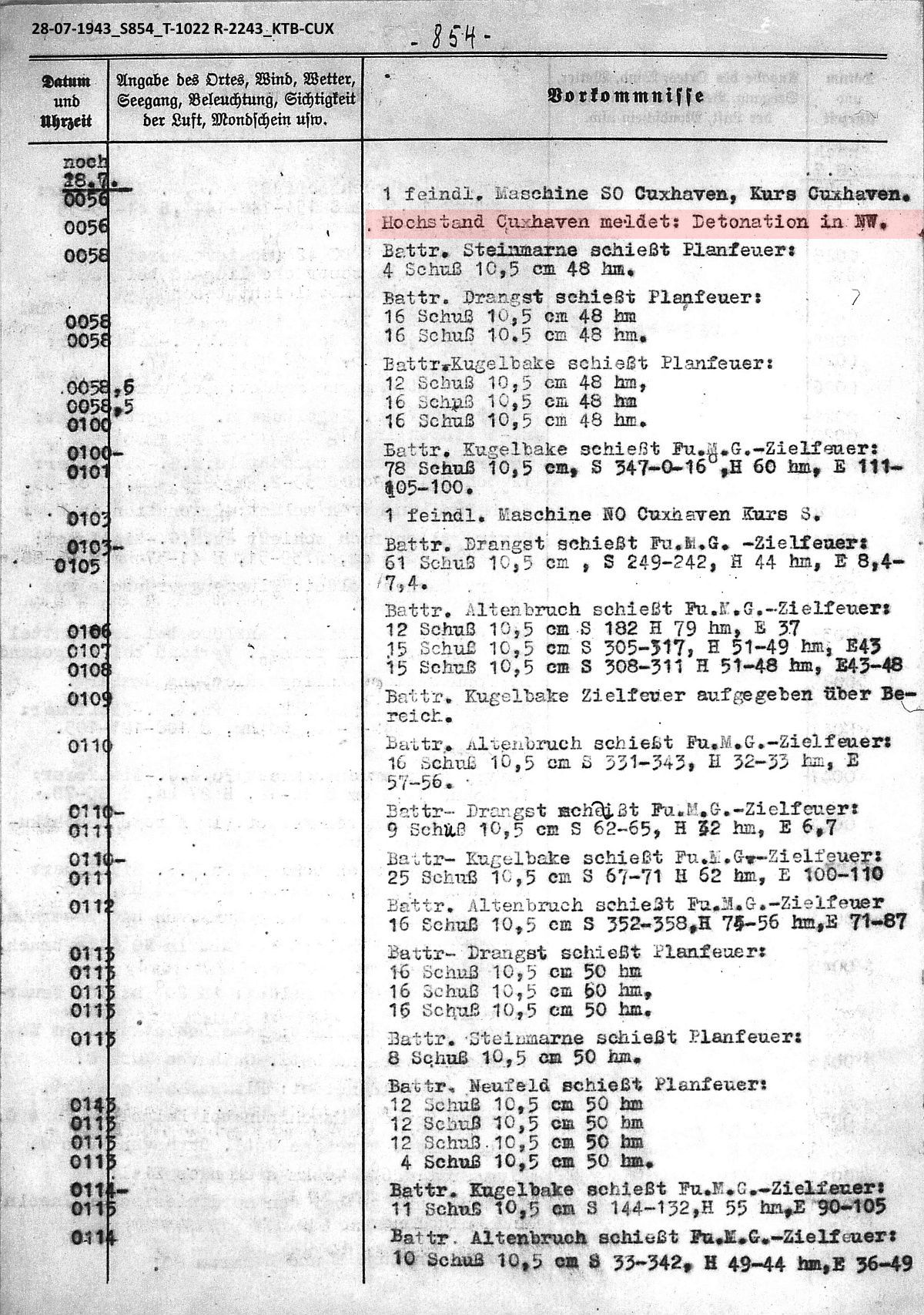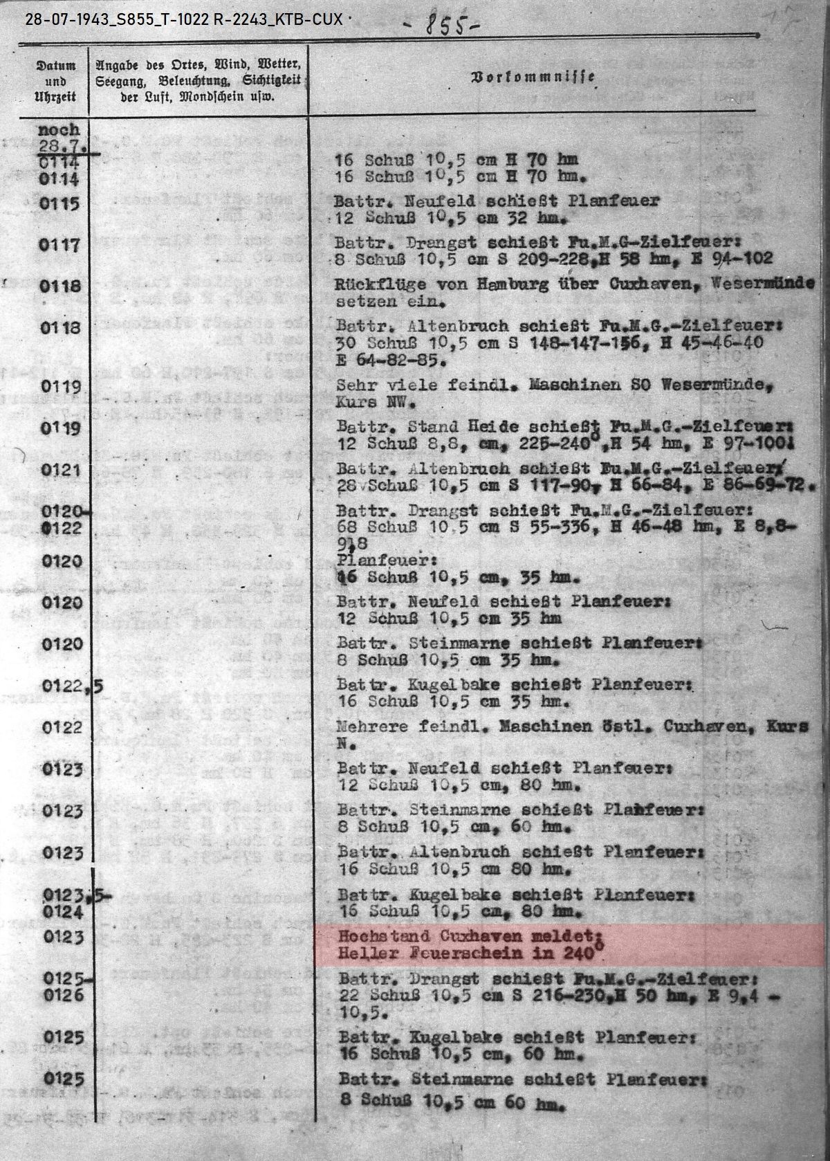24/25.07.1943 - Gefechtsmeldungen vom ersten Überflug alliierter Bomberformationen während der "Operation Gomorrha" im Abschnitt Cuxhaven.