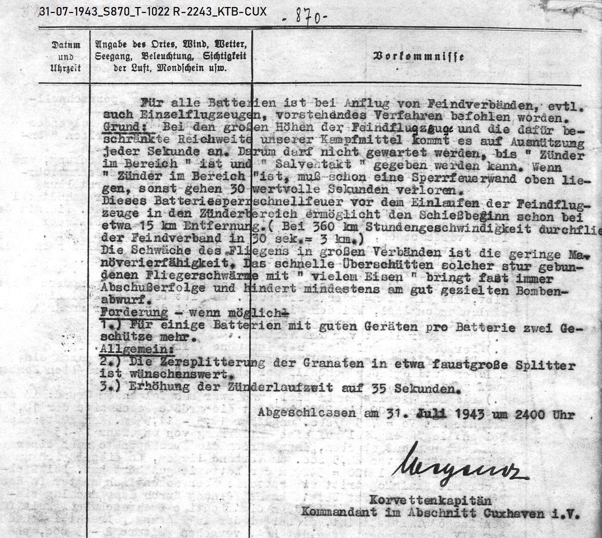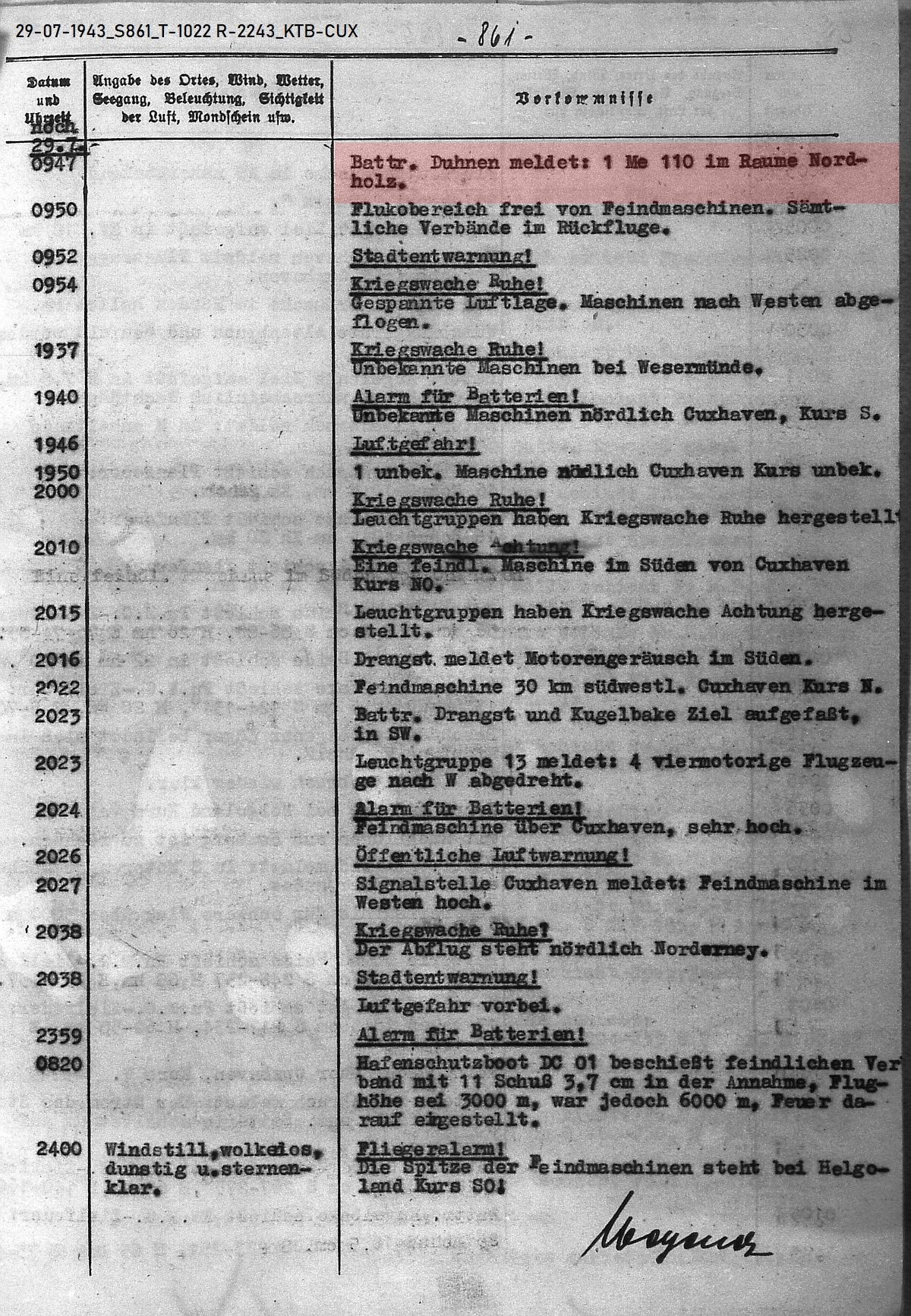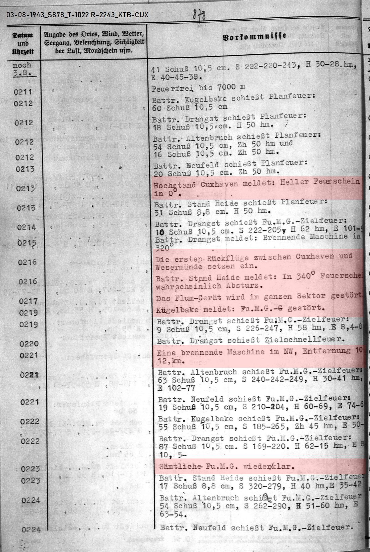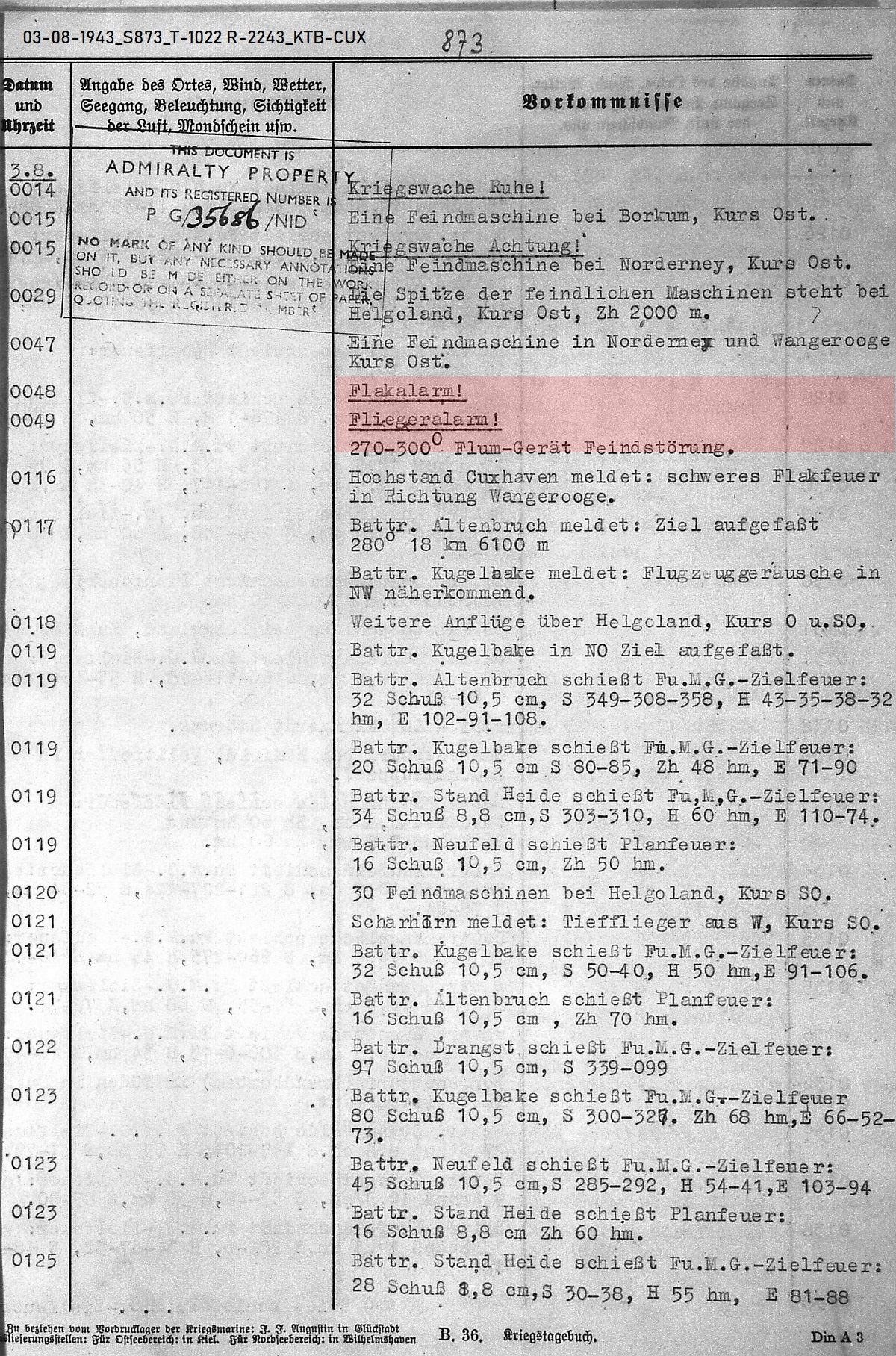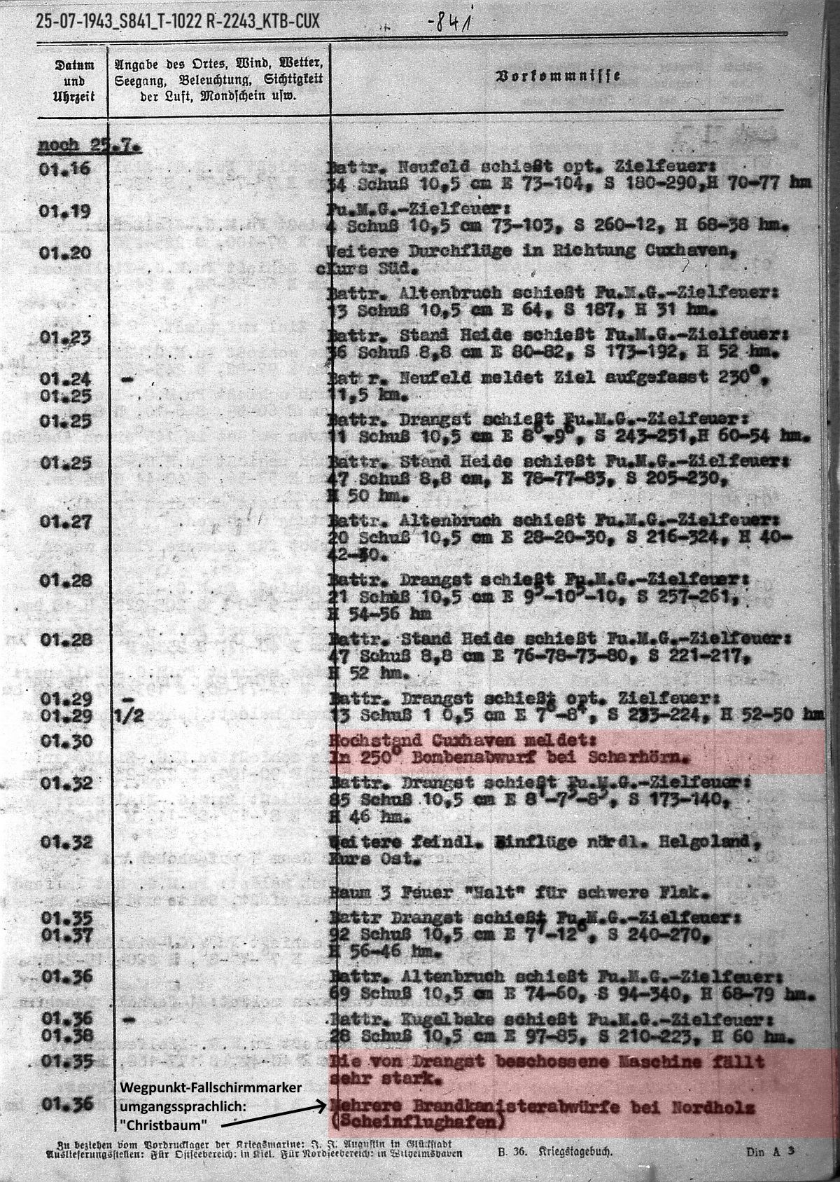 24/25.07.1943 - Gefechtsmeldungen vom ersten Überflug alliierter Bomberformationen während der "Operation Gomorrha" im Abschnitt Cuxhaven.