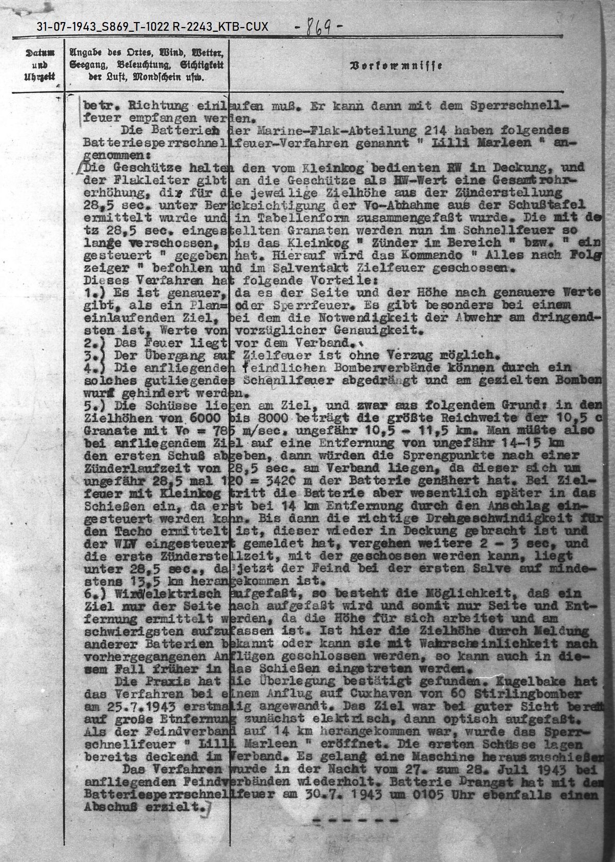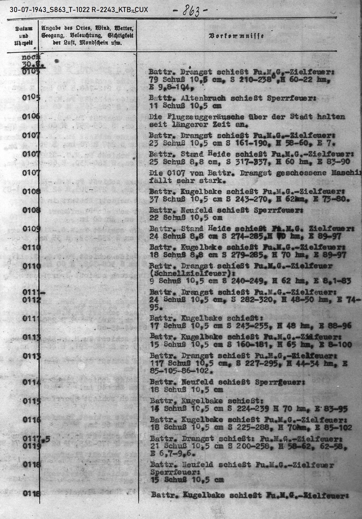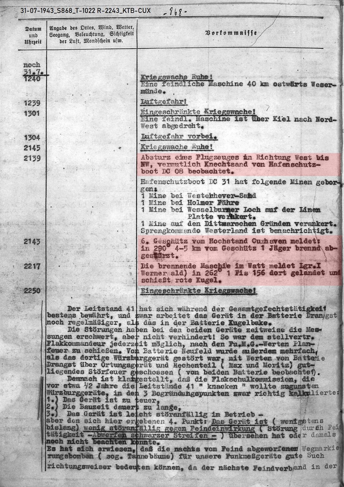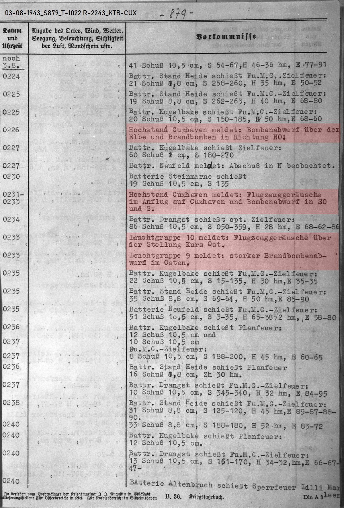 24/25.07.1943 - Gefechtsmeldungen vom ersten Überflug alliierter Bomberformationen während der "Operation Gomorrha" im Abschnitt Cuxhaven.