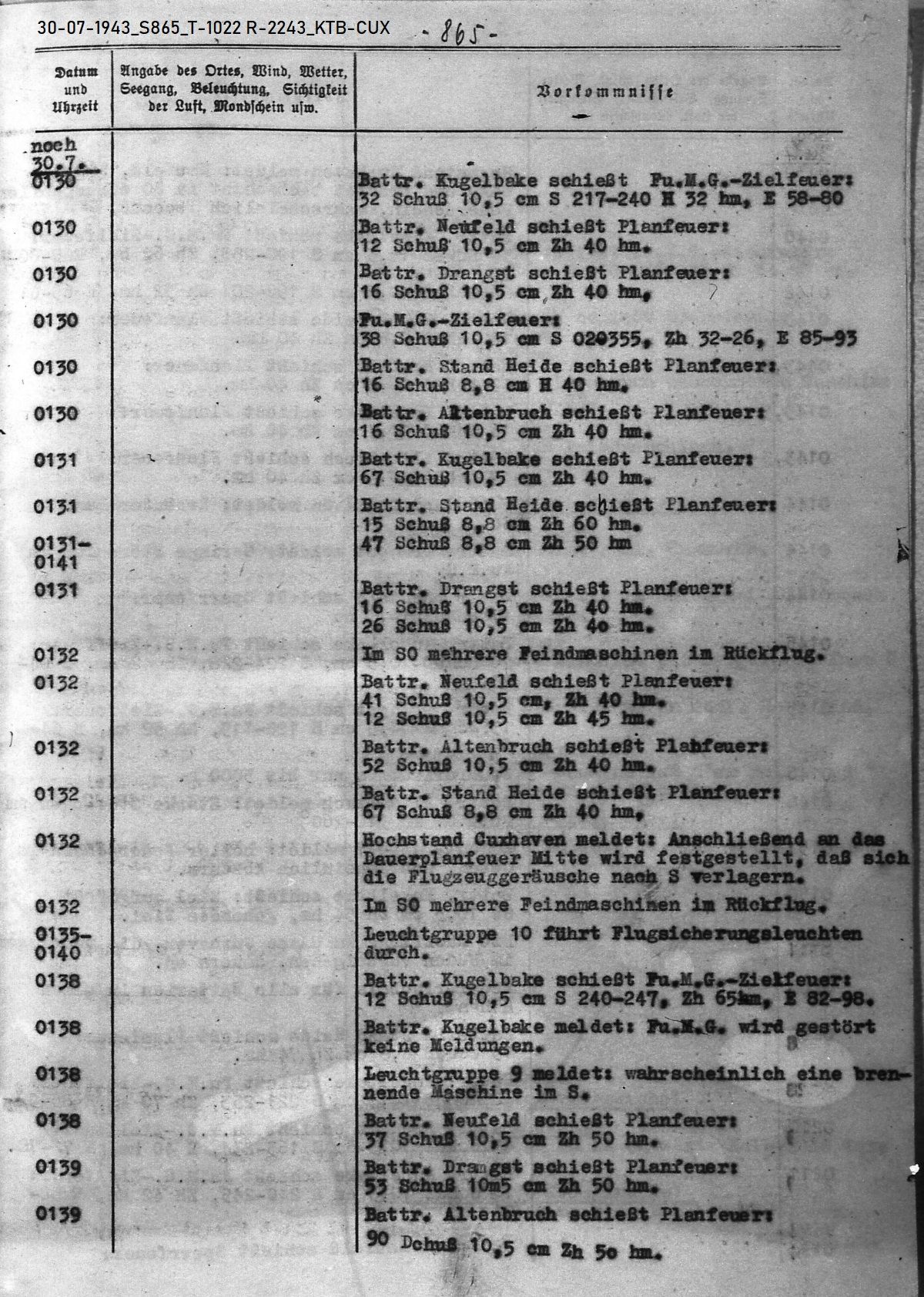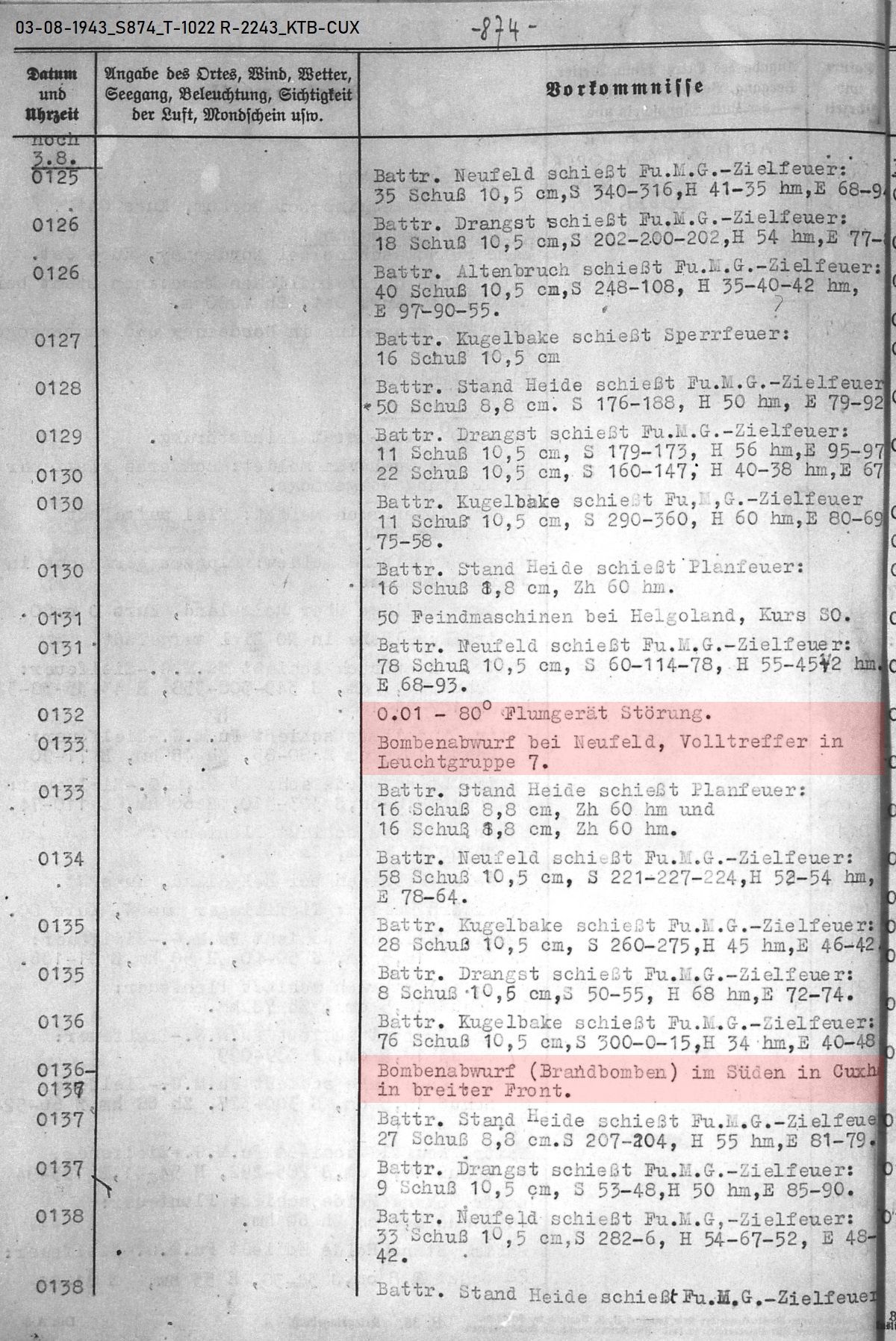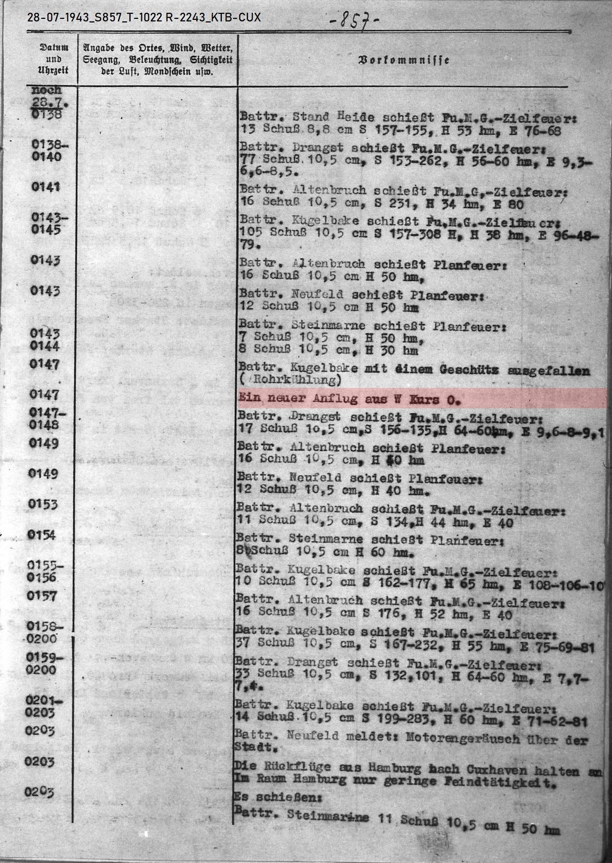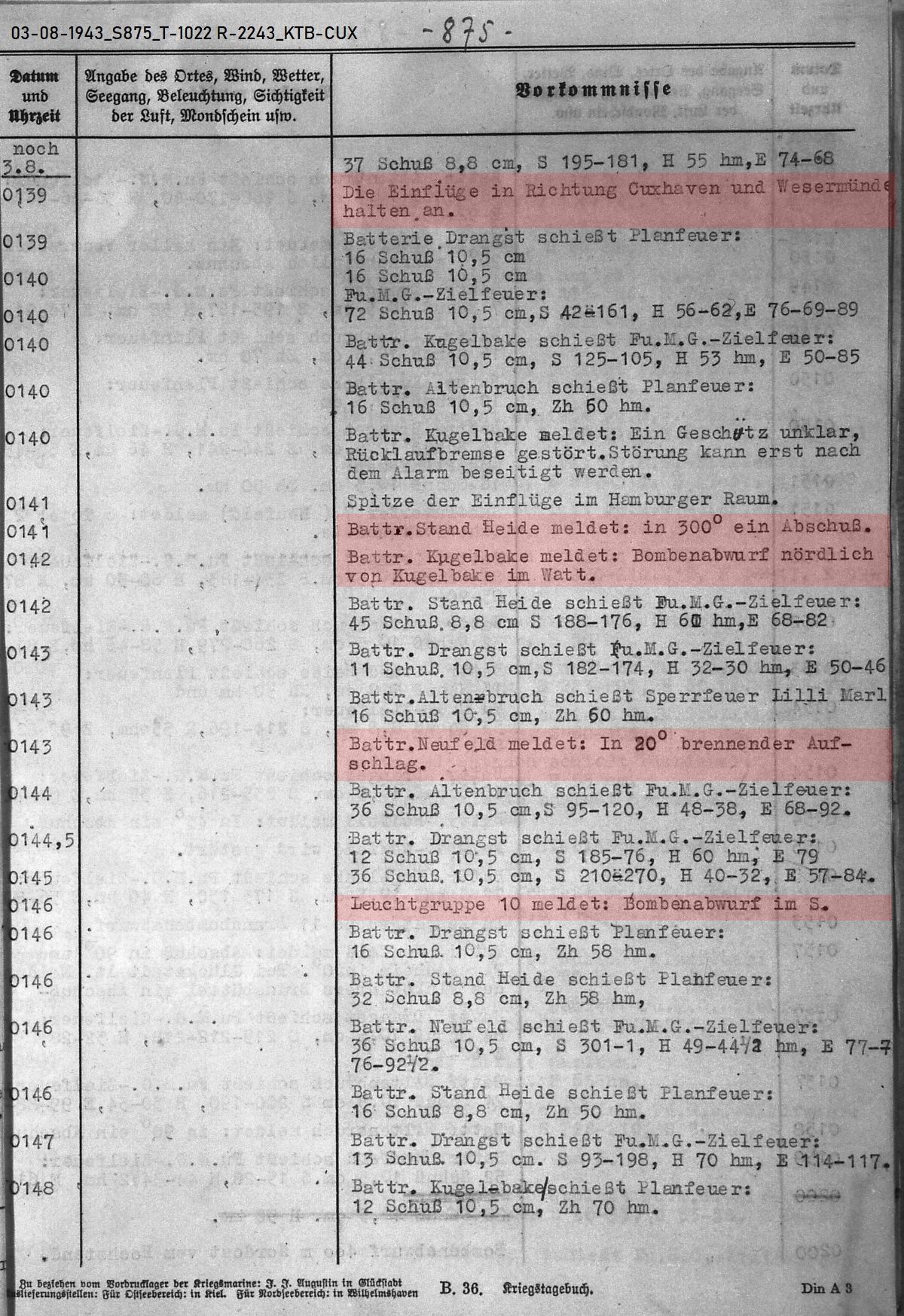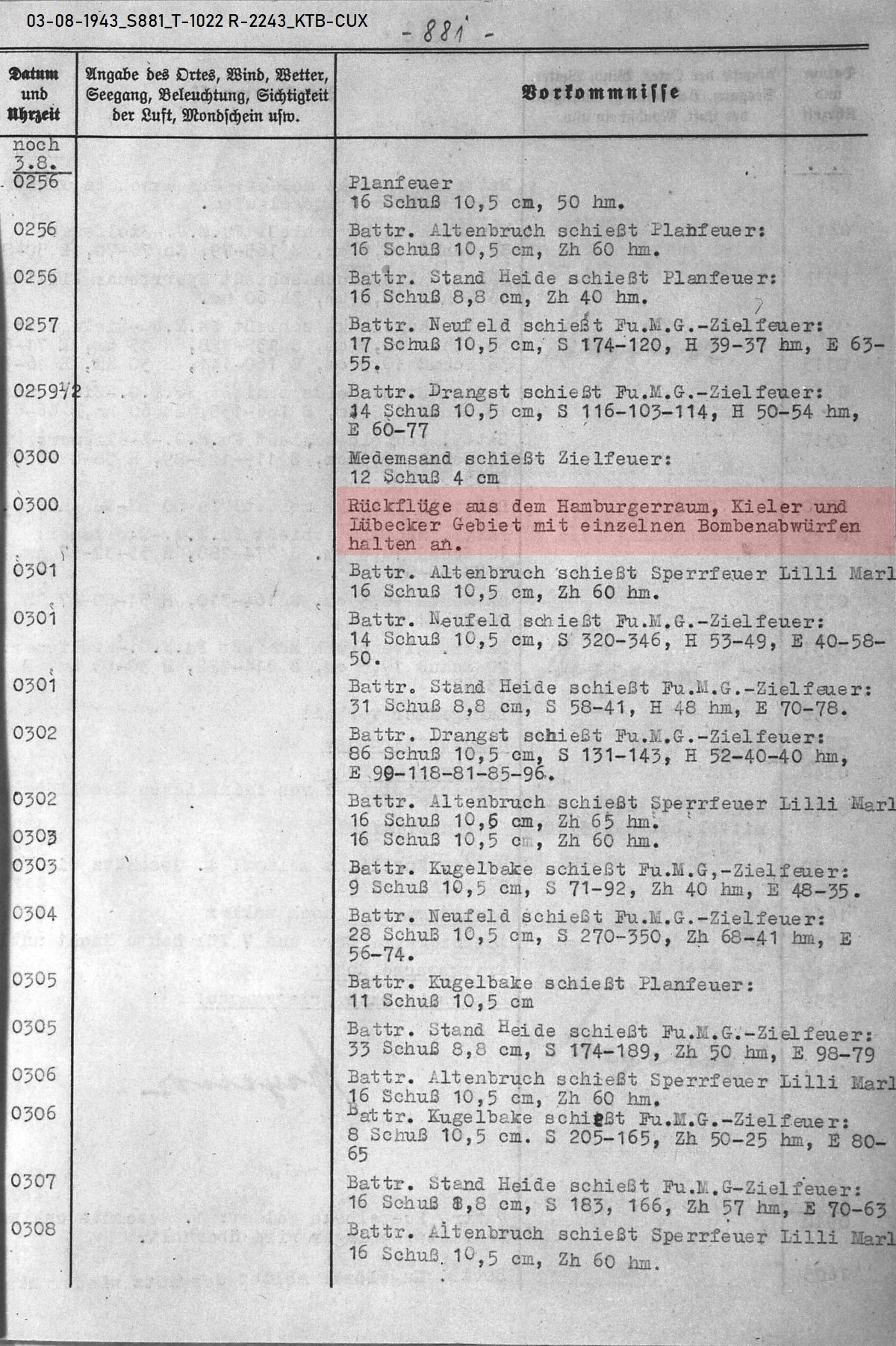 02/03.08.1943 - Vierter und letzter schwerer Luftangriff auf die Stadt Hamburg im Rahmen der "Operation Gomorrha". Die starken Überflüge über den Abschnitt forderten die Cuxhavener Flakabteilungen erneut..