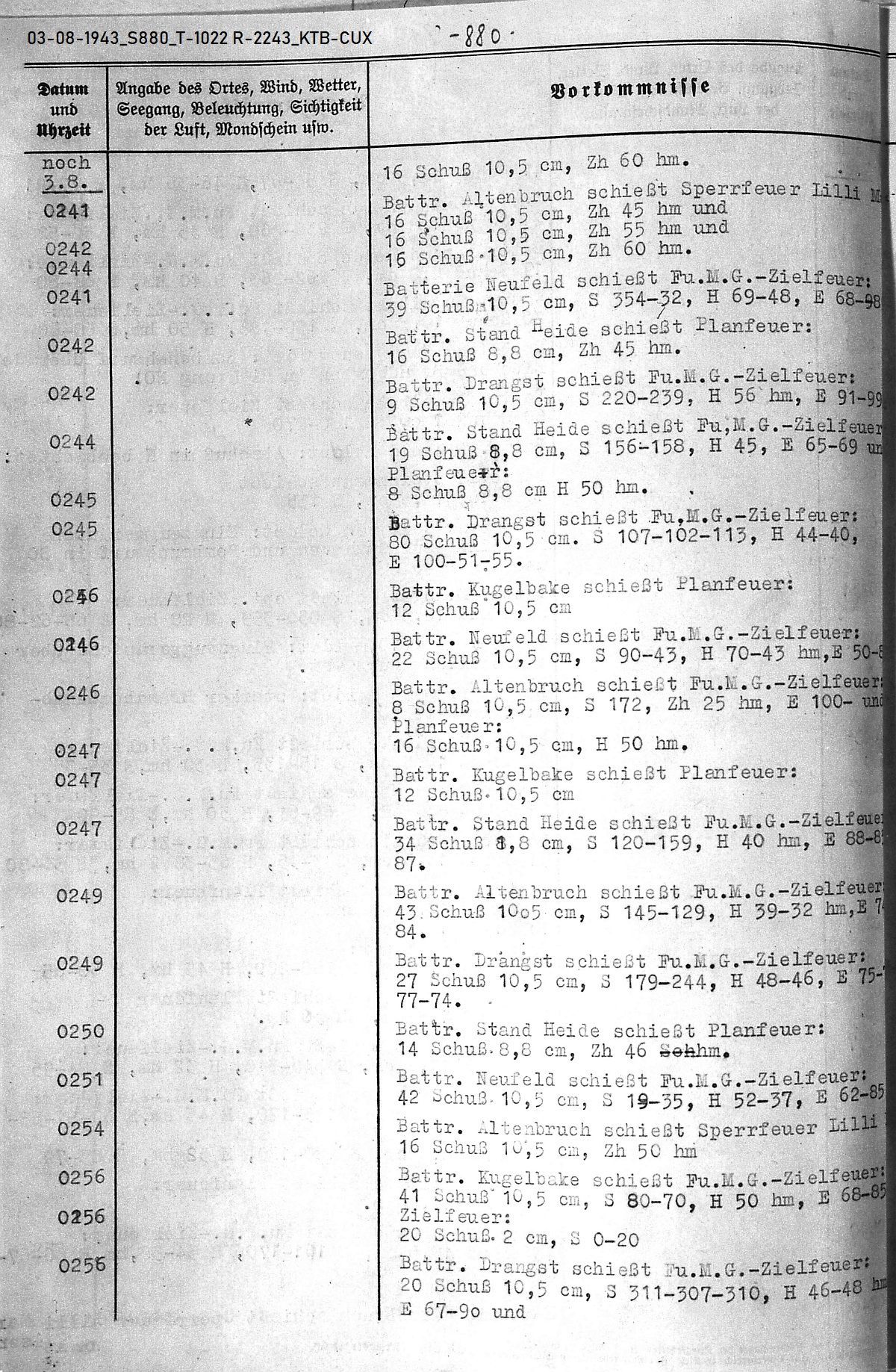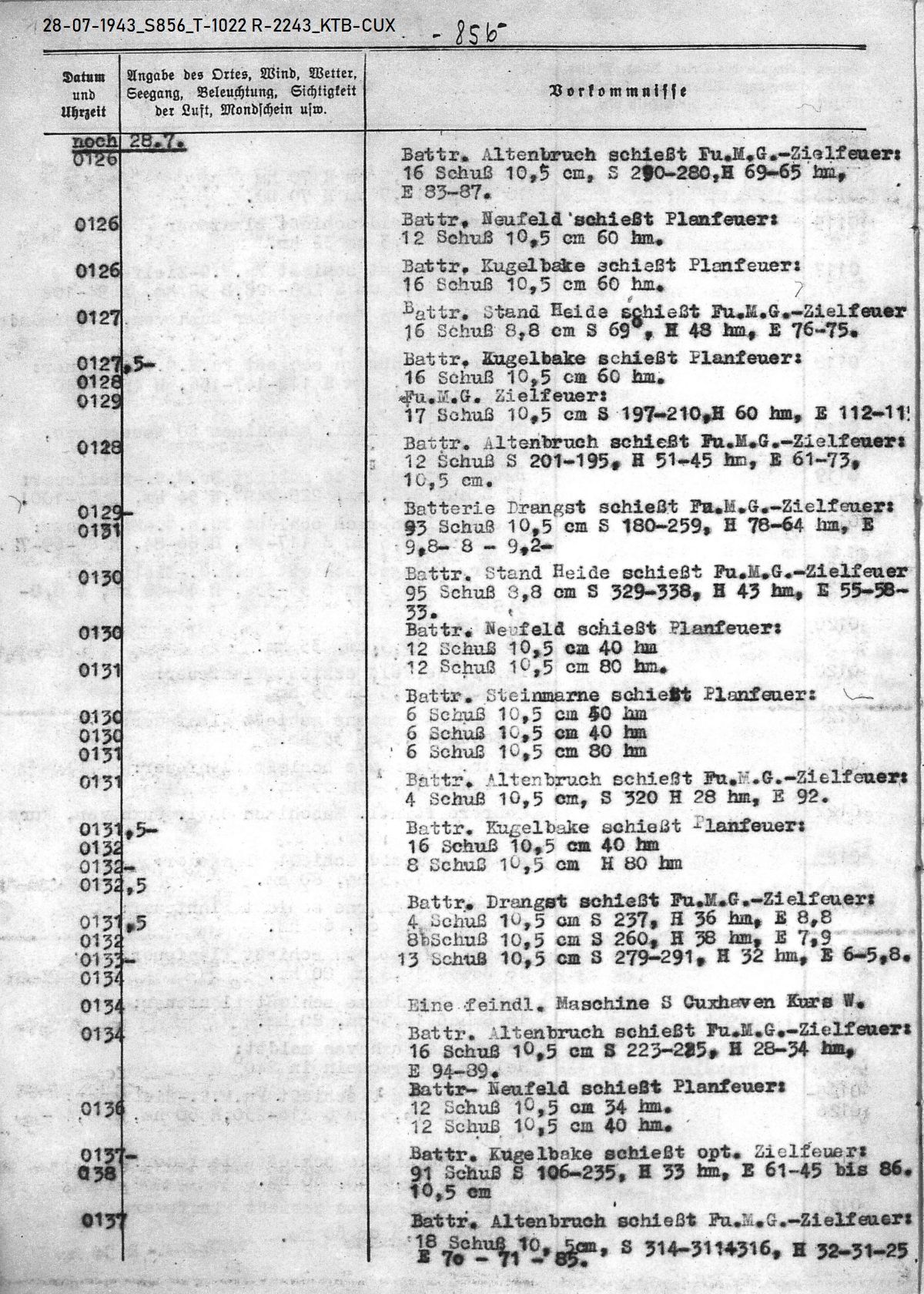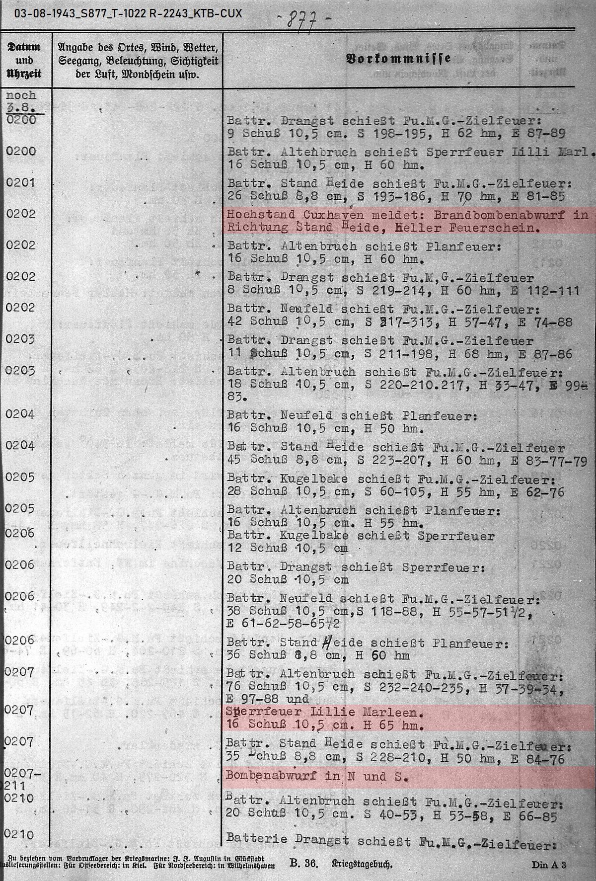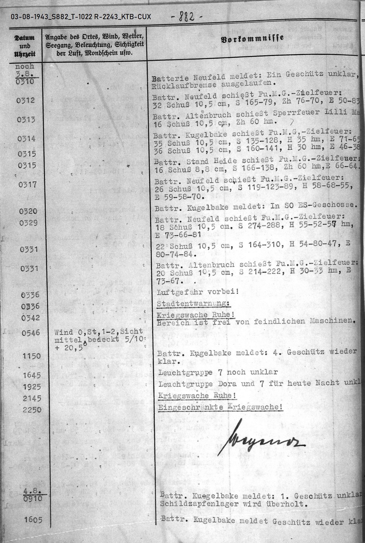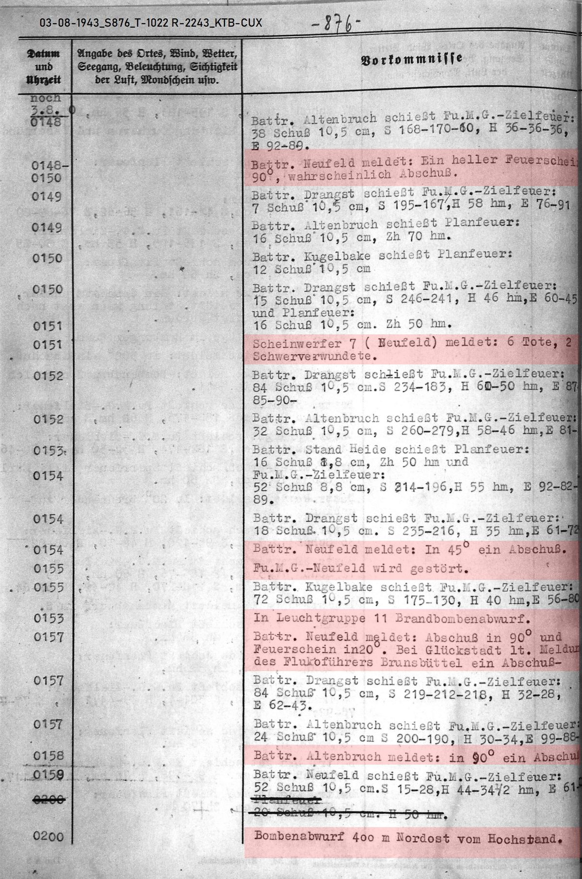 02/03.08.1943 - Vierter und letzter schwerer Luftangriff auf die Stadt Hamburg im Rahmen der "Operation Gomorrha". Die starken Überflüge über den Abschnitt forderten die Cuxhavener Flakabteilungen erneut..