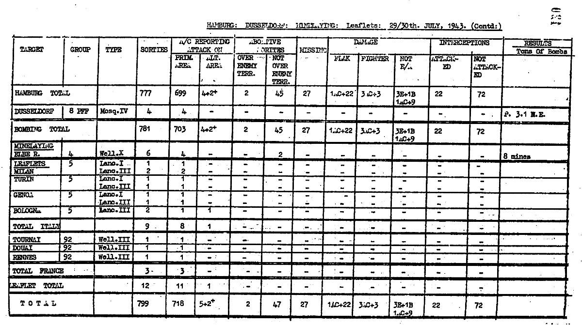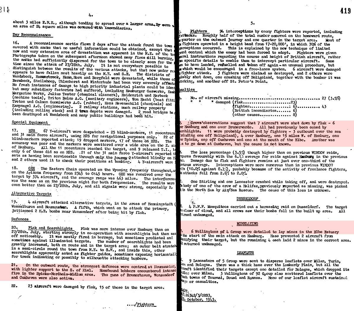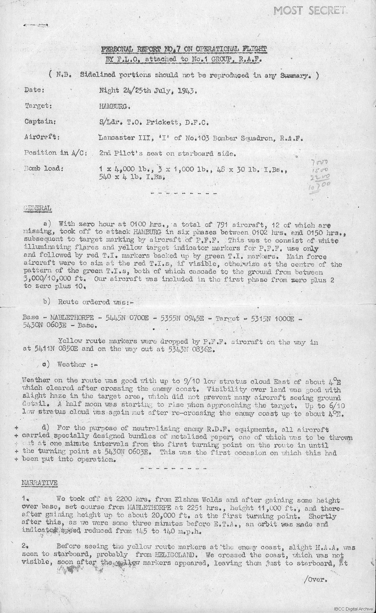 24/25.07.1943 - Abschließender Bericht des britischen Geschwaderführers S/LDR.T.O. M Prickett des 103. Bomber Squadron R.A.F.