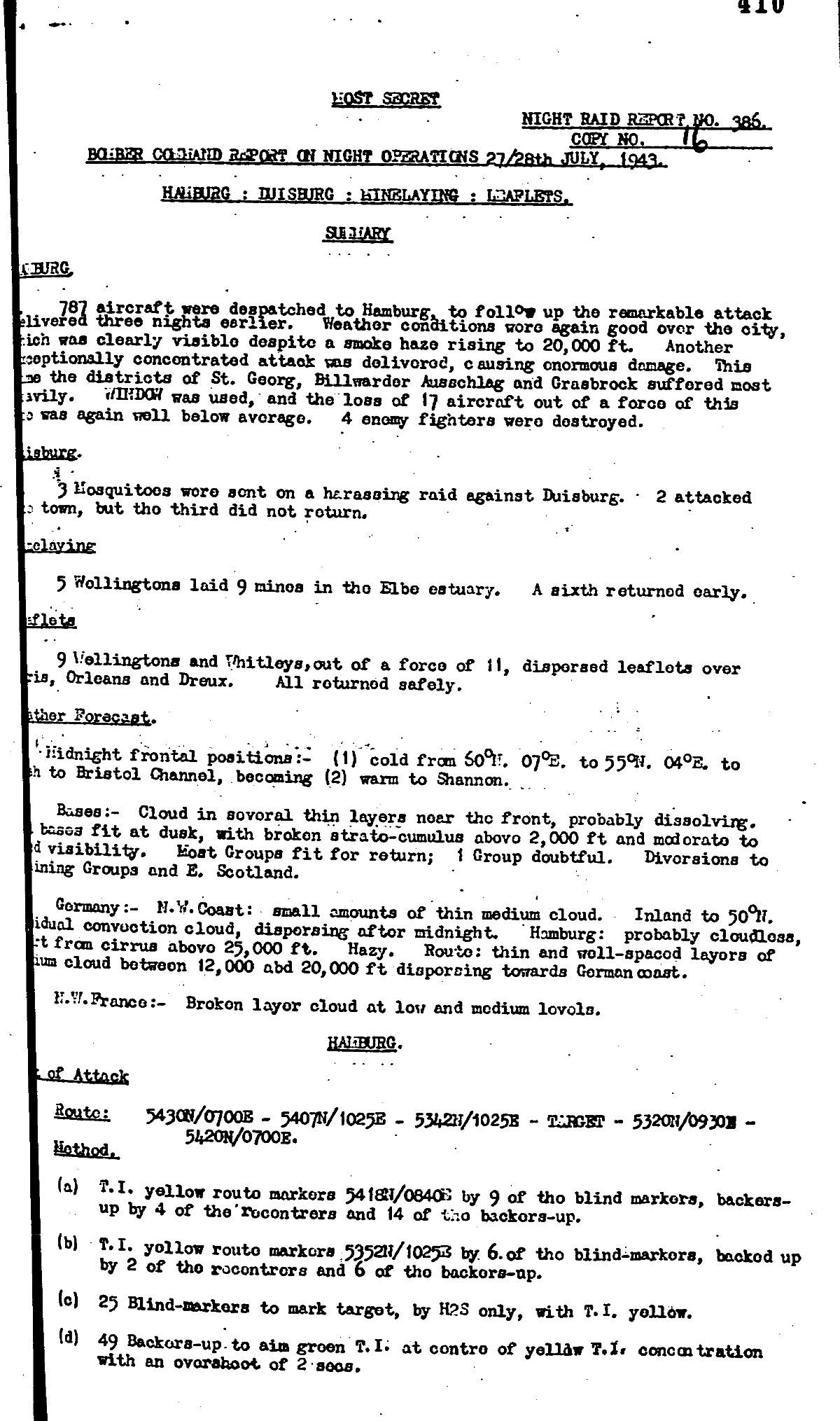 27/28.07.1943 - Abschließender Bericht des britischen Bomber Kommandos zum Luftangriff in dieser Nacht. RAF Night Report 386.