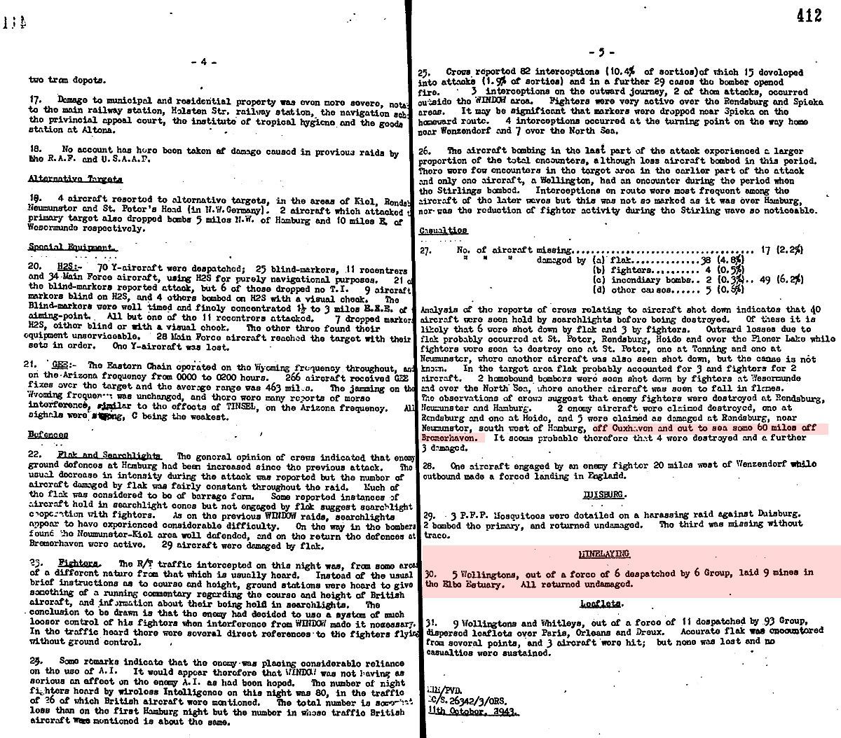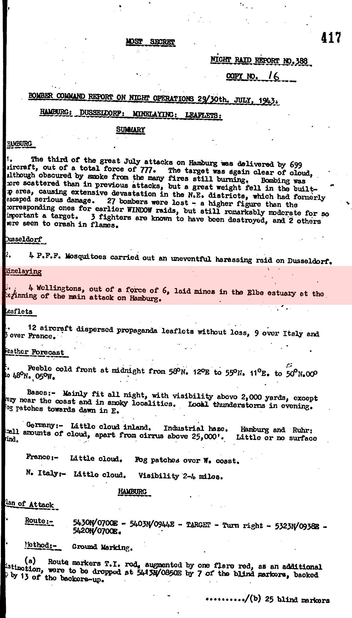 29/30.07.1943 - Abschließender Bericht des britischen Bomber Kommandos zum Luftangriff in dieser Nacht. RAF Night Report 388.