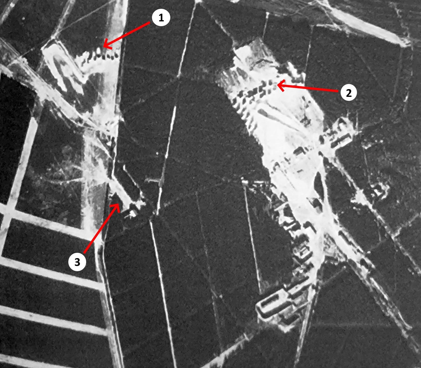 1. Neuer Beschußstand, 2. Alter Beschußstand mit dem großen Schießgerüst, 3. Testgelände mit Abschußrampen der Marschflugkörper und Gleitbomben / Foto nach Kriegsende 1945.
