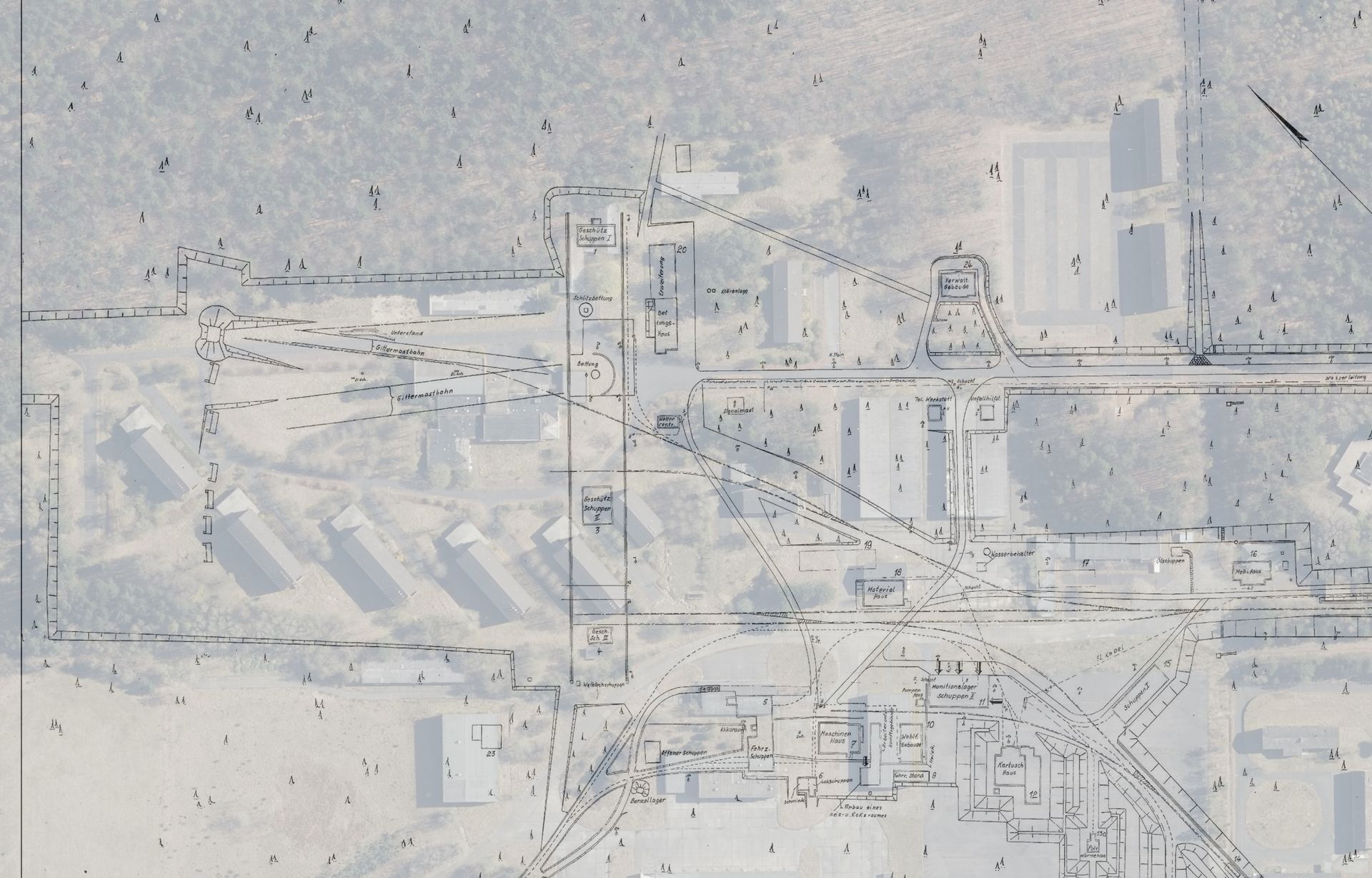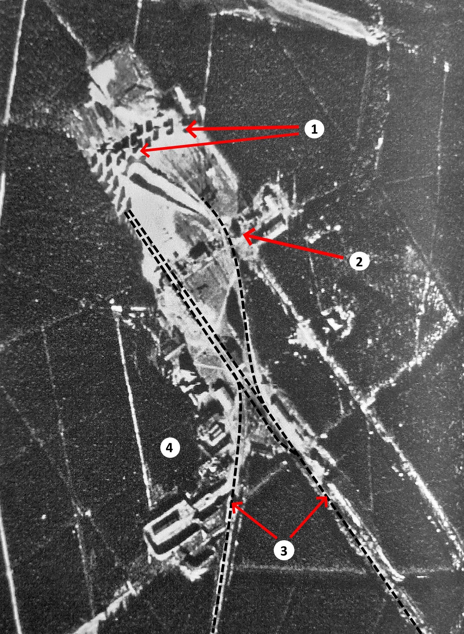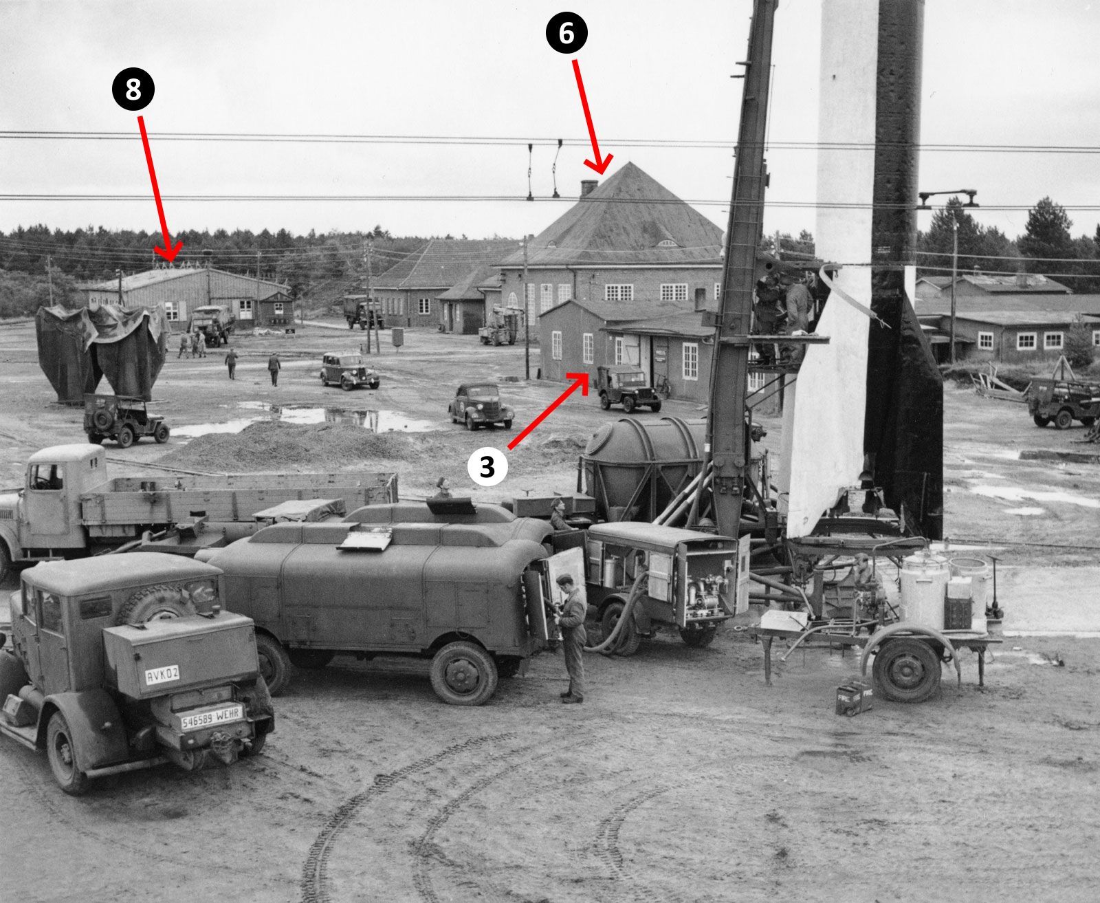 mit Gleisanschluß. Es liegt in einer Senke und ist zu drei Seiten mit einem Wall umfasst. Offenbar handelt es sich auf dem Dach um einen schon damals entsprechenden Blitzschutz. Die davor liegenden Behälter sind Komponenten für das Aggregat 4 (V2), die nach dem Krieg für die Operation Backfire hier zusammen gesammelt wurden.