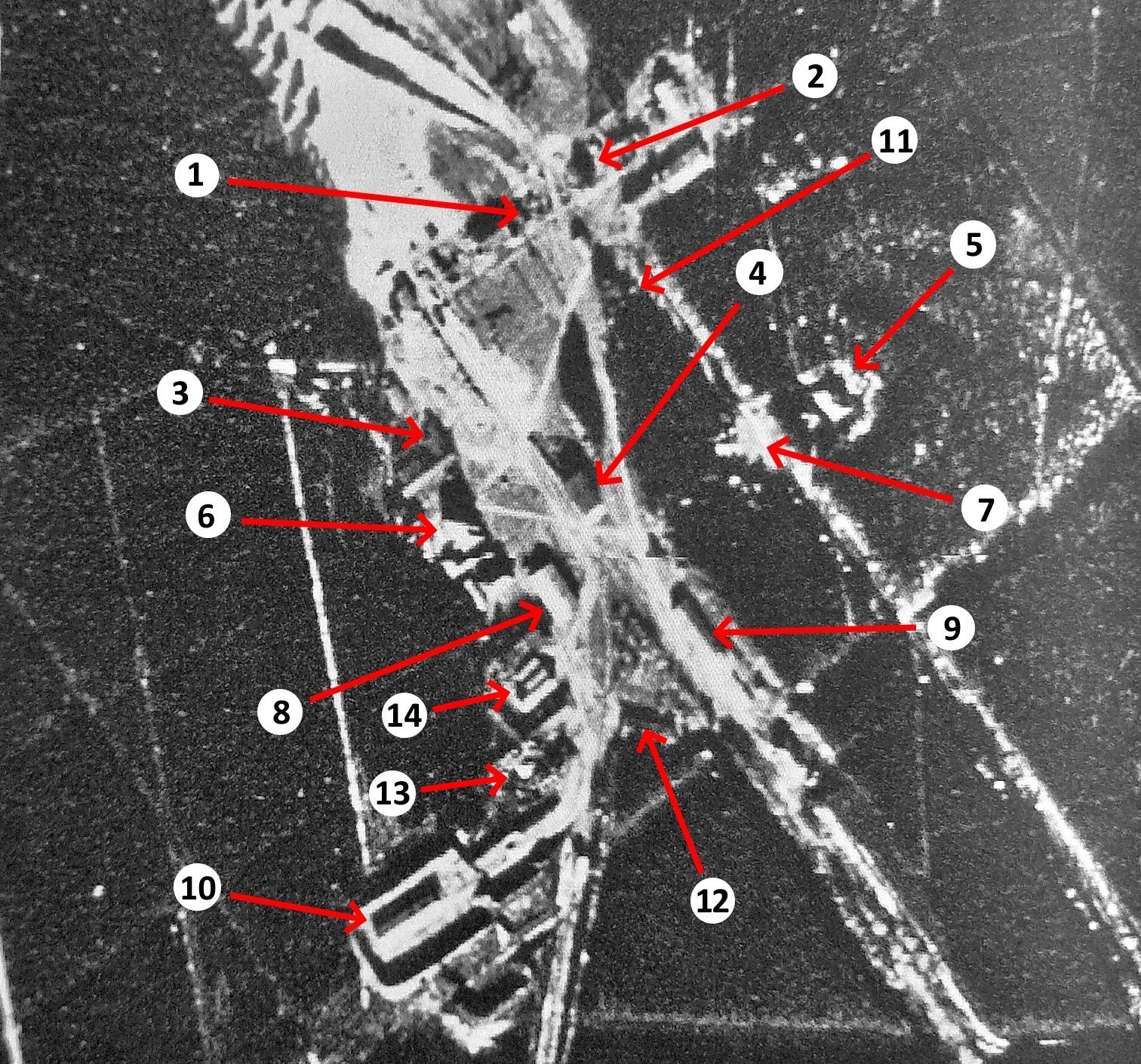 Nr.4. Rechts daneben, die 1946 gebaute Montagehalle für A4/V2 Komponenten.