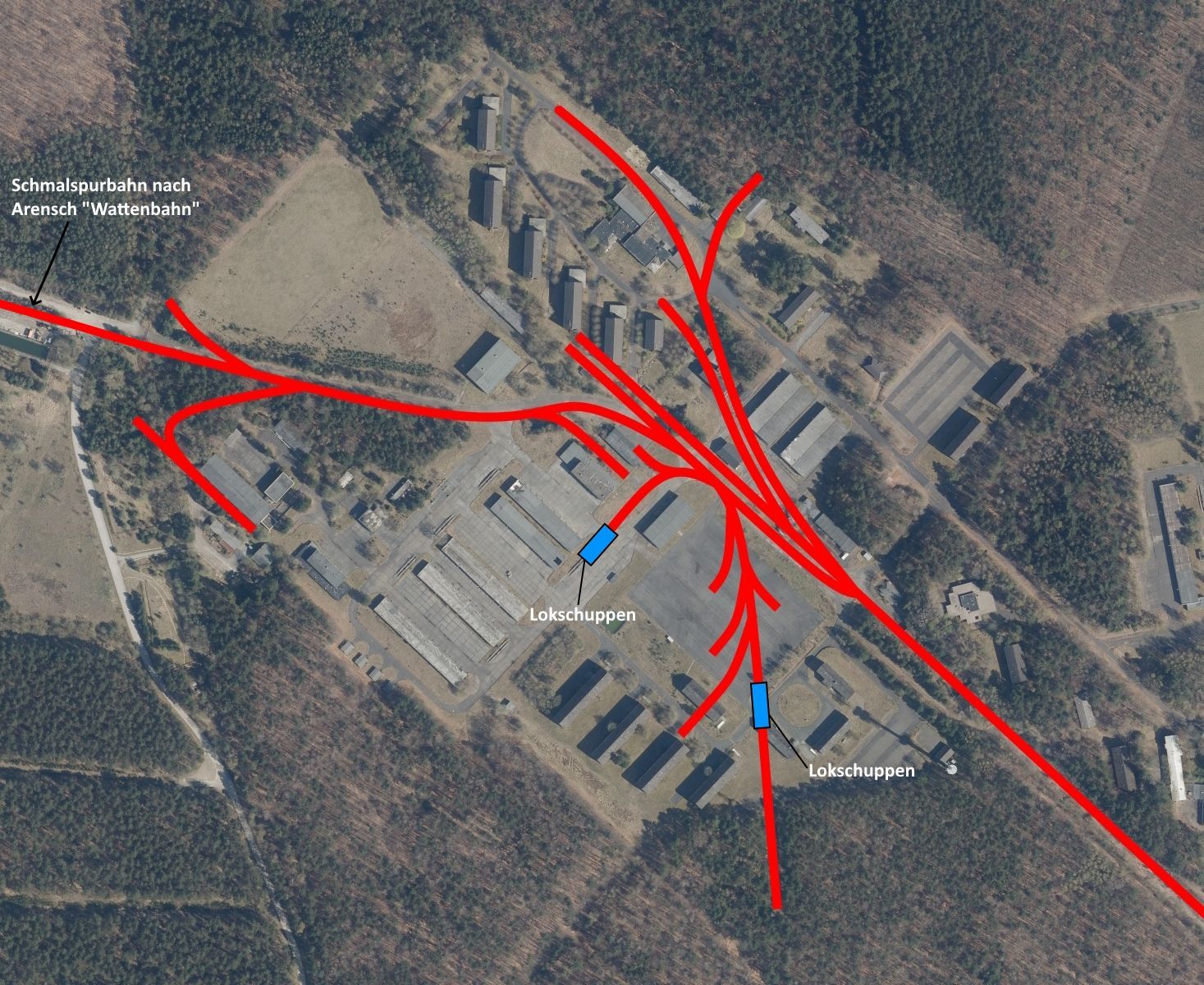 Auf dem gesamten Areal befand sich ein ausgedehntes Schienennetz für die Normalspurbahn, dass an das Netz der Reichsbahn angeschlossen war. Auf ihm konnten die schweren Geschützteile direkt bis an die Bettungen der Versuchsanlage gefahren werden. Ausserdem war es auch möglich, Eisenbahngeschütze direkt bis auf die Schießbasis zu fahren. Hinzu kam noch eine Kleinspurbahn für entsprechende Transporte, ein Gleis (Damals umgangssprachlich 'Wattenbahn' genannt) führte unter anderem über den gesamten Schießplatz bis nach Arensch.