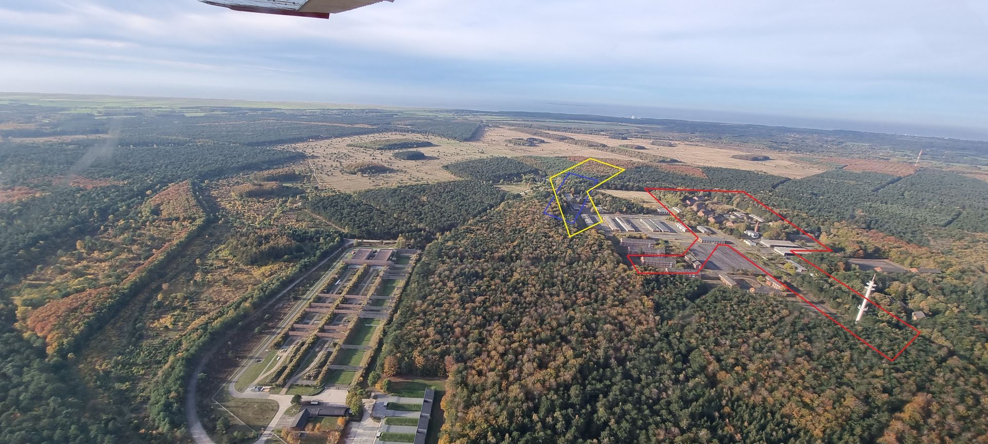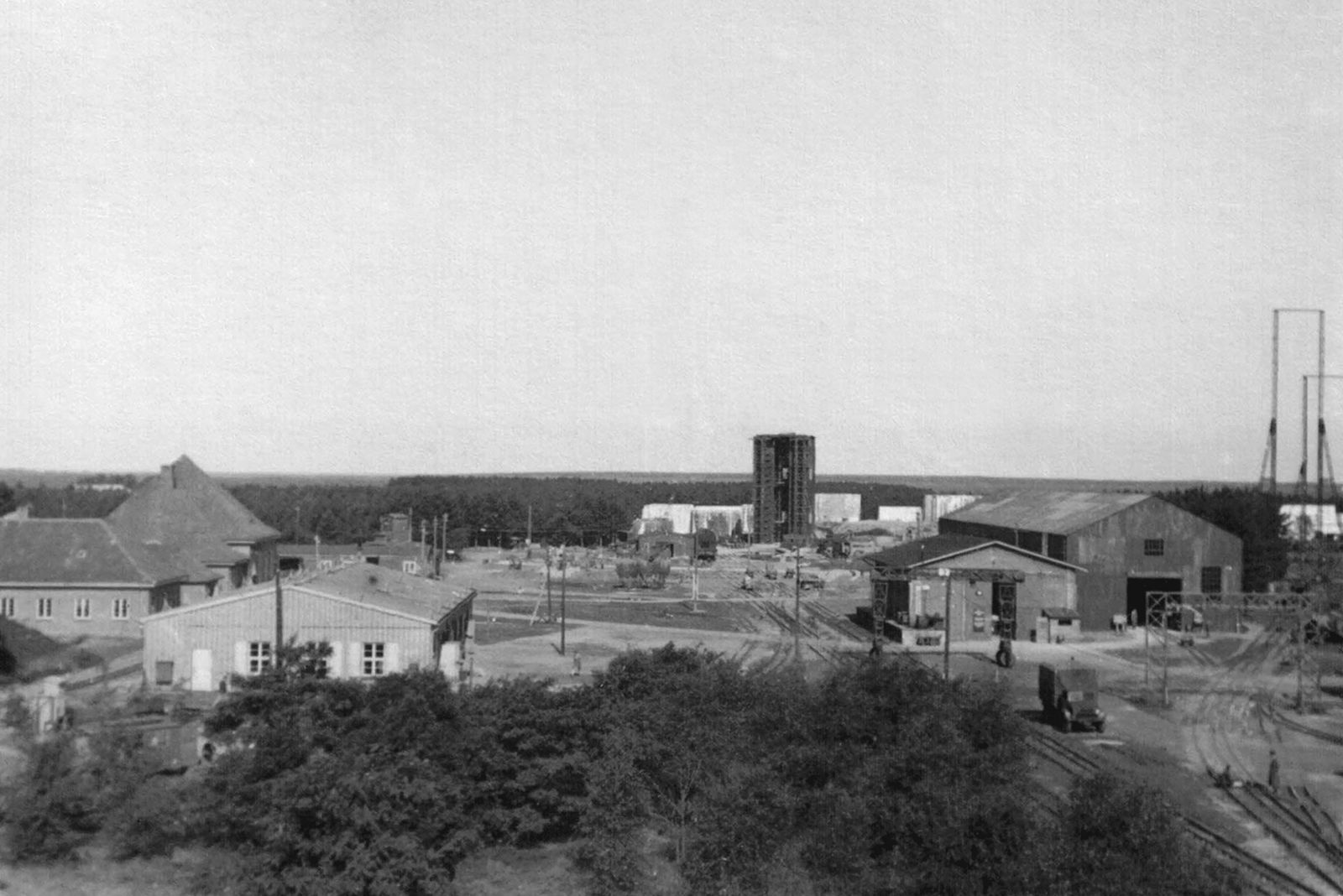 Zwei unterschiedliche Fotos, der selbe Ort. Auf dem Foto von 1946 im Hintergrund die Beschußstände. Davor rechts das Schießgerüst, links der Fertigungsturm für die V2 (Operation Backfire/1945). Davor der markante Signalmast der bereits auf älteren Fotos vor 1918 zu erkennen ist. Sicht von Osten. Das Foto von 2023 zeigt den Kasernenbereich des ehemaligen Panzergrenadierbattallions 71/73.