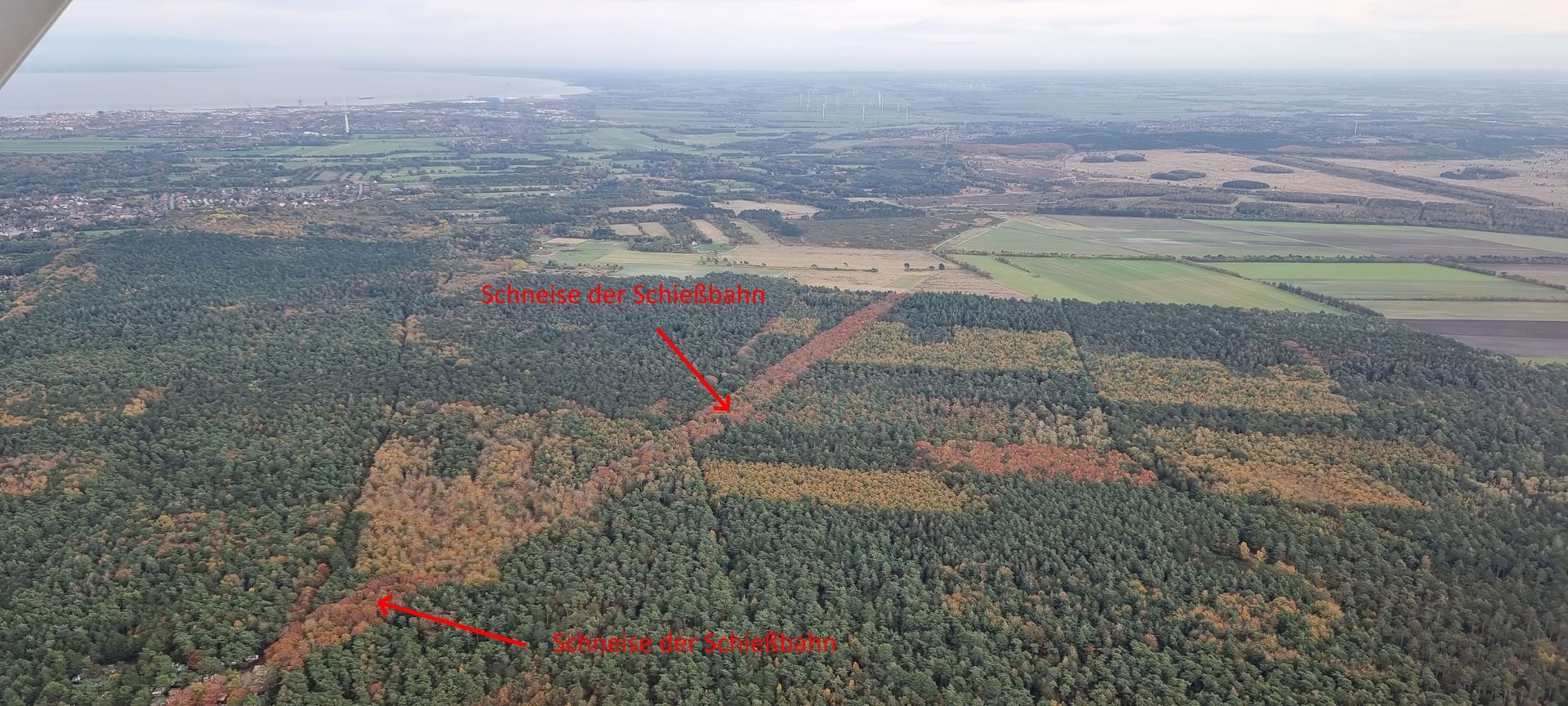 Gerade im Herbst erkennt man durch die Verfärbung des Laubes die Neuanpflanzung der östlichen Grenze der damaligen Schießschneise, die seinerzeit als Abgrenzung gerodet wurde.