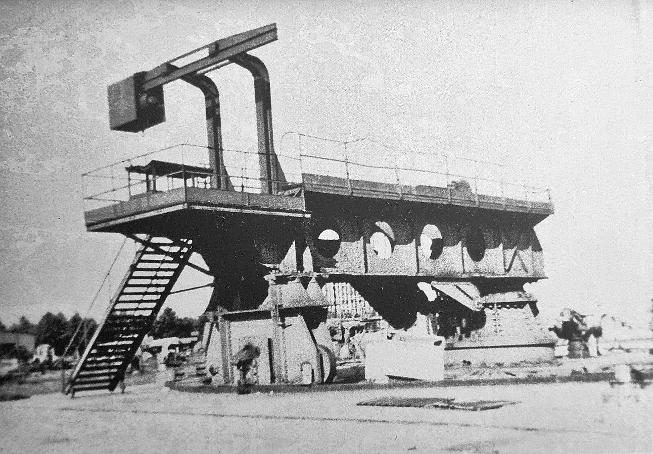 Die bis 1947 bestehende 160 Tonnen Portalkrananlage wurde bereits während des ersten Weltkriegs genutzt, hier beim Aufbau des Ferngeschützes 'Wilhelm'. Die britischen Streitkräfte sprengten die Krananlage und den Abschussturm der Geschützbettung am 10.12.1947, die endgültige Demontage der Bettung selbst erfolgte 1948.