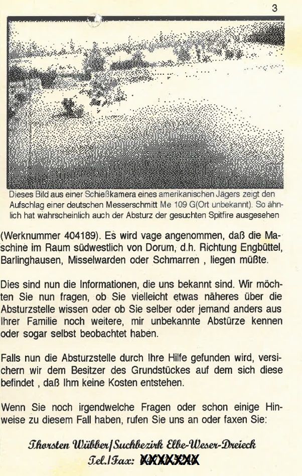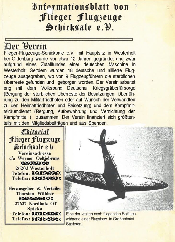 Der Flyer von 1996 zur Suche vom Abschuß der AB301 der in Berensch auf die entsprechenden Zeitzeugen traf, die sich an den Vorfall erinnern konnten.