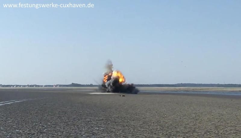 Gegen 14 Uhr erfolgte dann die kontrollierte Sprengung. Unter Verwendung von 2,5 Kilogramm Sprengstoff wurde die Mine per Fernzündung fachgerecht zerstört. Zuvor waren vorsorglich alle Anwohner und Besucher aufgefordert worden, das Wattgebiet zwischen Kugelbake und Cuxhaven-Duhnen einschließlich der Strandpromenade zu verlassen.