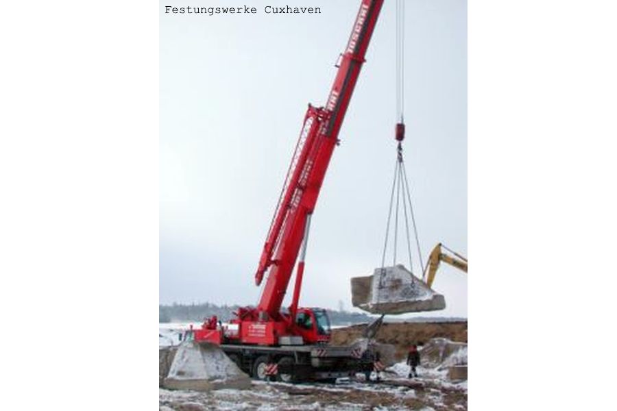 Drei der rund 40 Tonnen schweren Betonblöcke, sowie mehrere kleinere Fundament- und Metallteile, konnten für das "Aeronauticum - Nordholz" geborgen werden.
